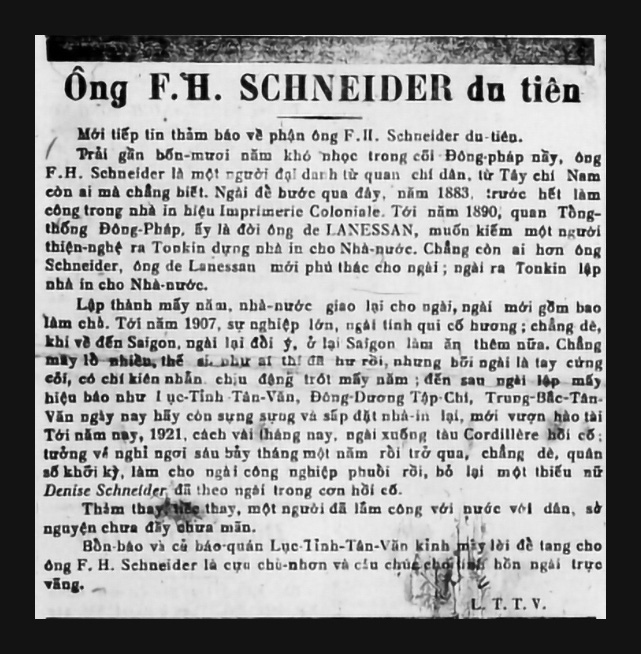 Đầu tháng 5-1919, có lẽ do tuổi già sức yếu không quản nổi tờ báo nữa, nên chủ báo Lục Tỉnh Tân Văn là ông F. H. Schneider đã giao lại quyền quản lý tờ báo cho ông Marty, trùm mật thám Đông Dương, lúc này đang là chủ nhiệm tờ Nam Phong ở Hà Nội, kiêm nhiệm tờ Lục Tỉnh Tân Văn.