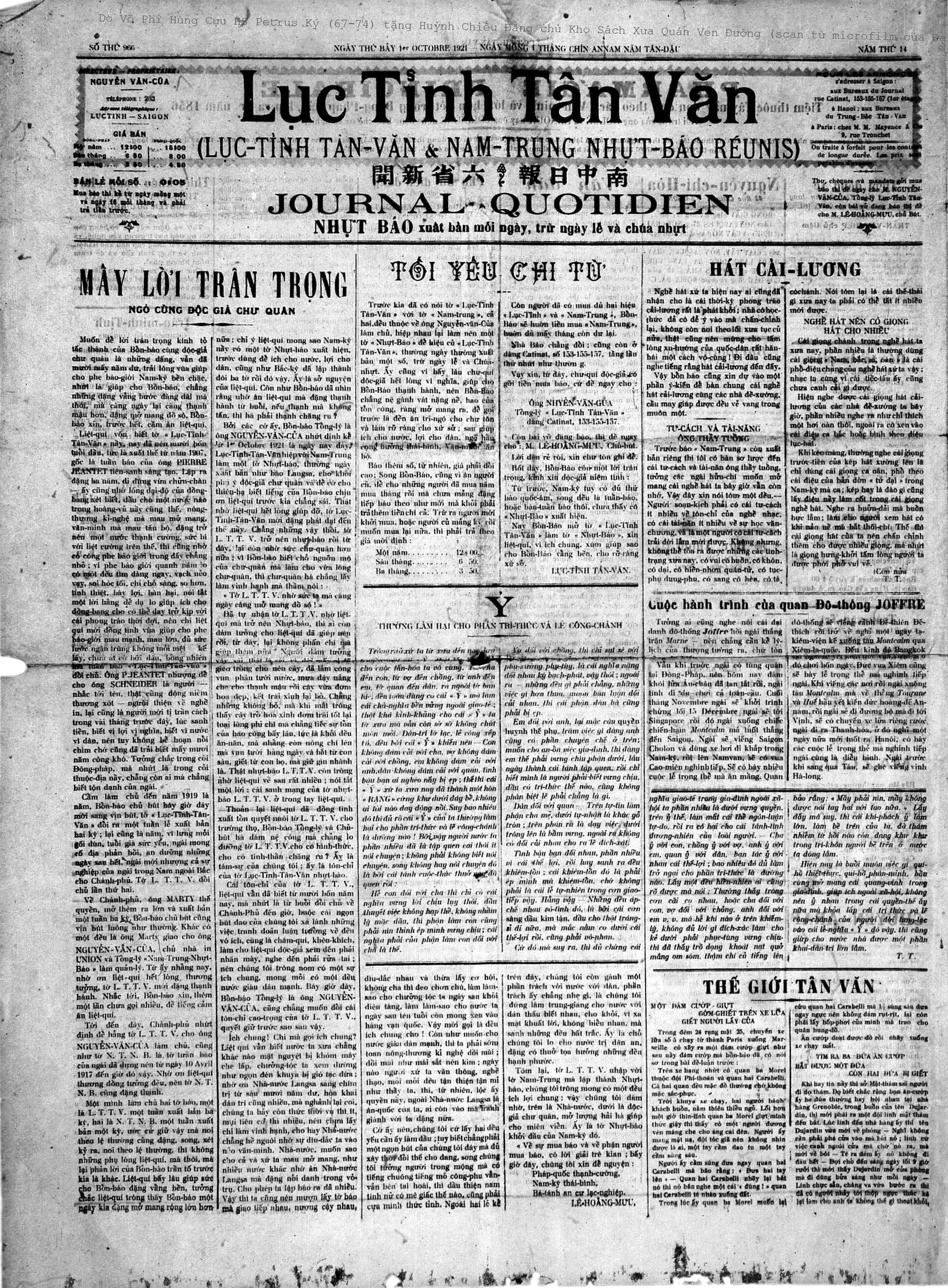 Xin liệt vị, vì ích chung, xúm giúp sao cho bổn báo vững bền cho rỡ ràng xứ sở". Báo do ông Nguyễn Văn Của làm tổng lý, ông Lê Hoằng Mưu làm chủ bút, tòa soạn đặt ở số 153-155-157 Catinat (nay là Đồng Khởi), có bốn trang khổ lớn, bài vở khá phong phú.