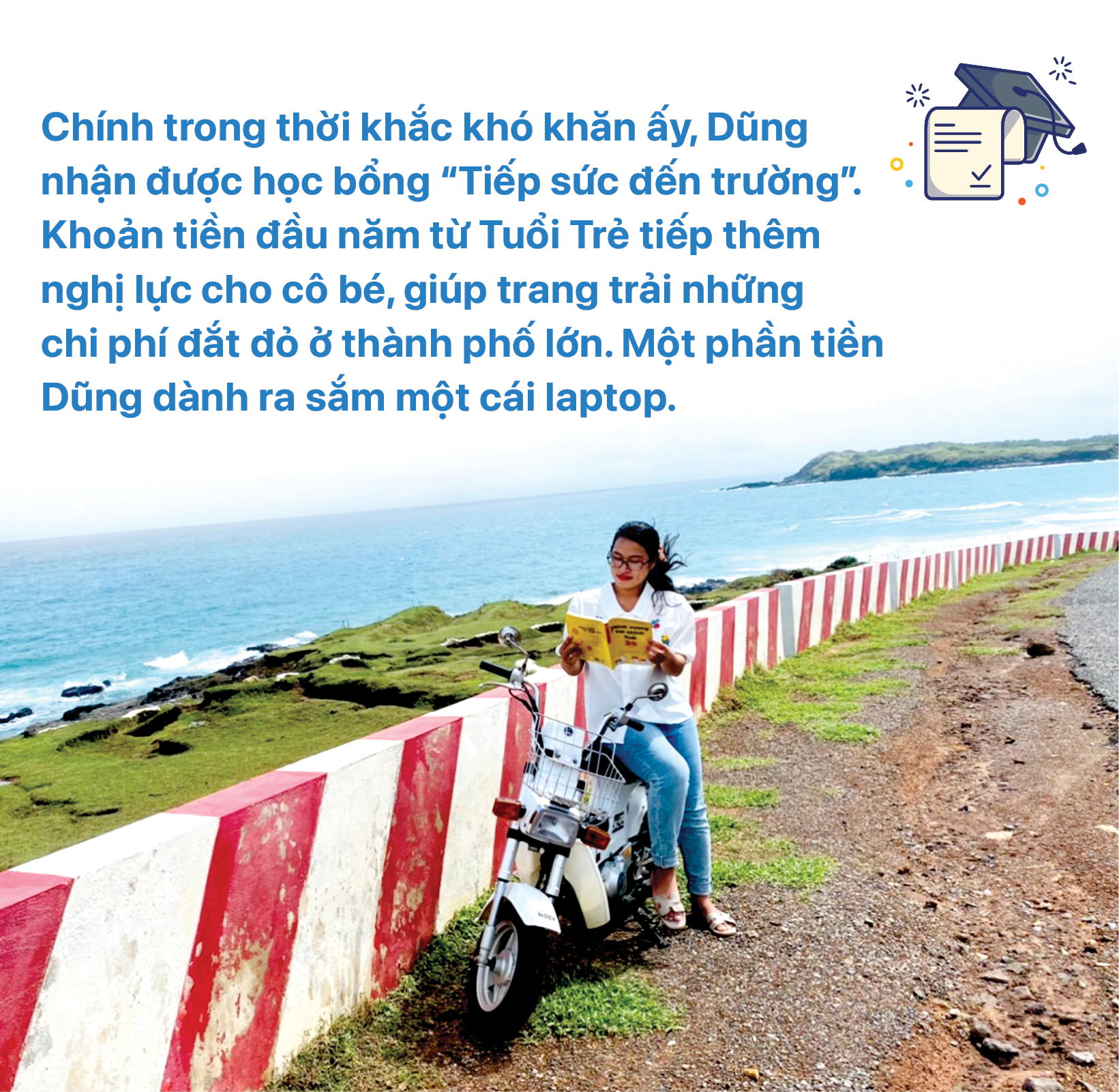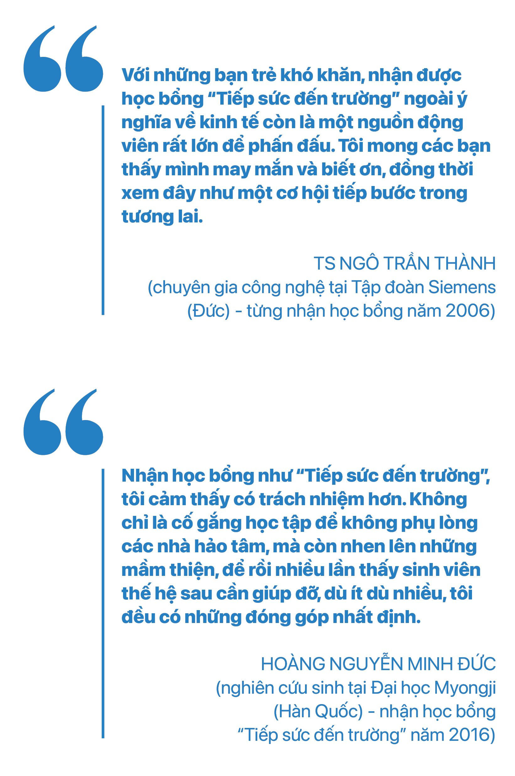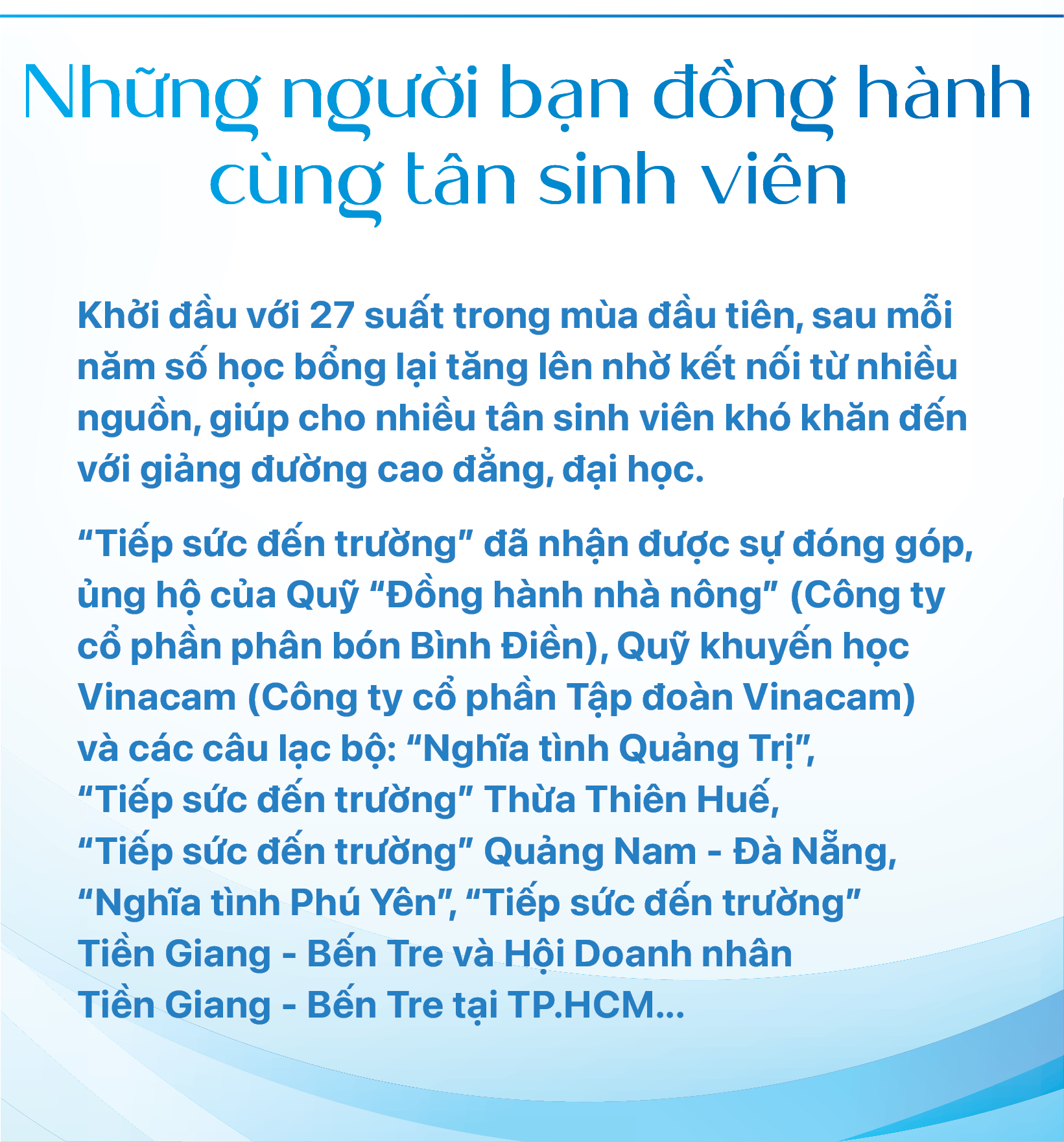 Tôi còn nhớ như in ngày ba chở đến nhận học bổng "Tiếp sức đến trường", đó là cuối tháng 10-2008. Học bổng thật sự là một bước ngoặt. Không chỉ hỗ trợ khoản tiền trước khi vào đại học mà còn giúp tôi kết nối với nhiều nhà hảo tâm, và họ đã đồng hành với tôi đến khi ra trường.