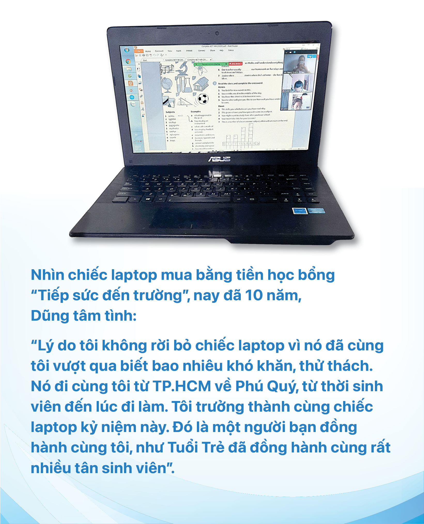 "Mấy năm nay, thấy kinh tế của tôi khá giả, lại rất thường dạy online, nhiều người hỏi vì sao gần 10 năm vẫn chưa chịu lên đời laptop mà cứ dùng mãi chiếc máy mua từ năm đầu lên đại học?", Nguyễn Thị Dũng (27 tuổi) tâm sự với chúng tôi từ huyện đảo Phú Quý (Bình Thuận).