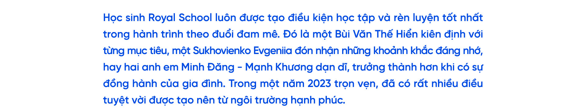 Cũng trong năm 2023, hàng loạt chủ đề đến từ ngôi trường hạnh phúc với những thông điệp giáo dục tích cực, lan tỏa đến từng thành viên tại Royal School và cộng đồng, có thể kể đến như: "Cảm ơn vì những lần đầu" dành cho lứa học sinh tốt nghiệp khóa đầu tiên, mỗi ngày hè là một trải nghiệm quý báu, "New School Year, Bright Future Here", Tôn vinh những sắc hồng rạng ngời với tinh thần "Be Pink, Be Royal", hay khuyến khích bài học tiên phong tạo nên những sự thay đổi trong chủ đề Changemakers,... qua đó ươm dưỡng những tài năng, khuyến khích mỗi học sinh phát triển theo cách riêng.