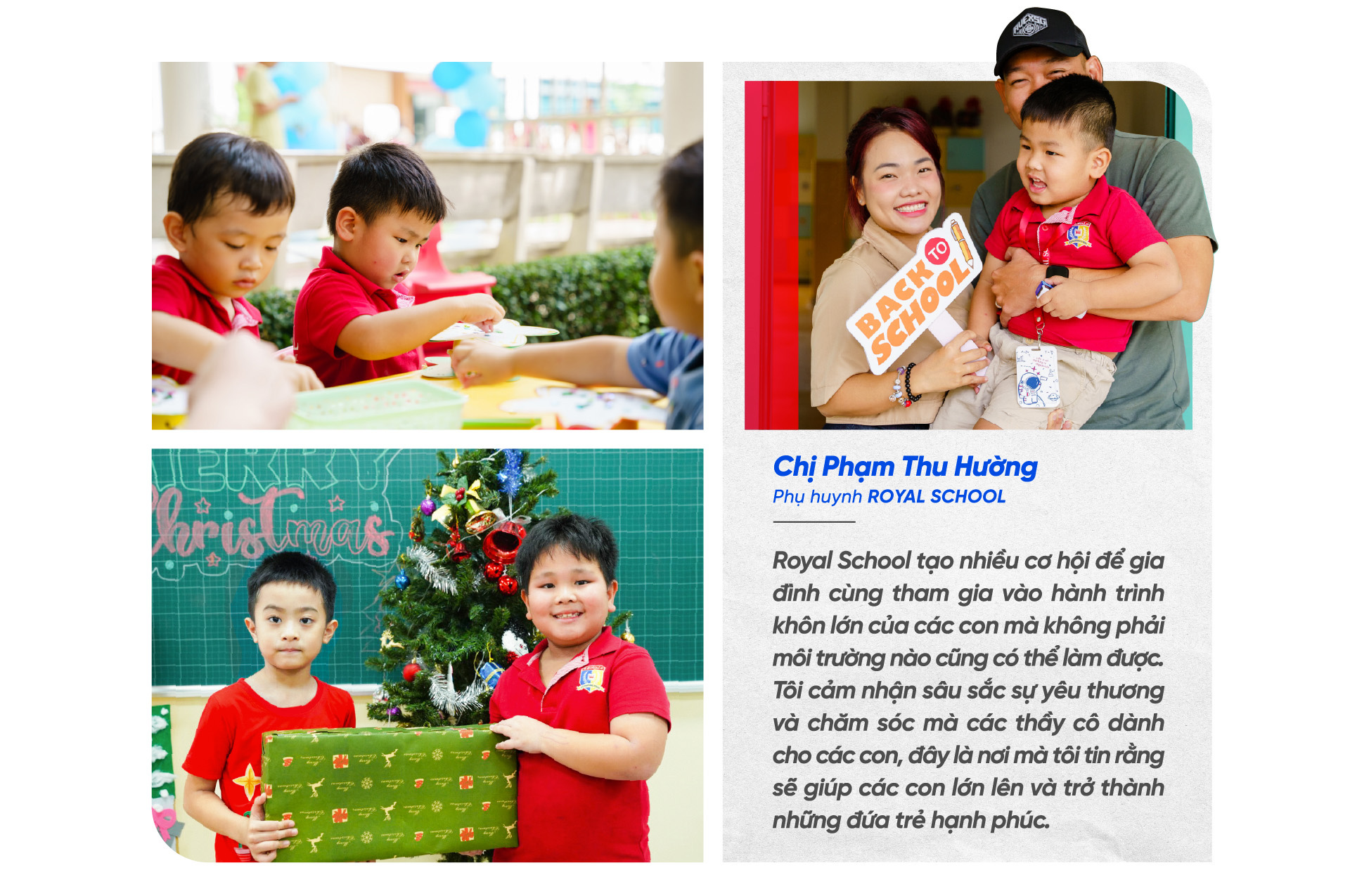 Chị Phạm Thu Hường (phụ huynh học sinh Huỳnh Phạm Minh Đăng và Huỳnh Phạm Mạnh Khương) là gương mặt quen thuộc tại Royal School khi thường xuyên đồng hành cùng con trong mọi hoạt động. Chị Hường bày tỏ sự tin tưởng khi Royal School luôn hoàn thành sứ mệnh của ngôi trường hạnh phúc, cung cấp nền giáo dục an toàn, lành mạnh và chuẩn quốc tế. Trong đó sự gắn kết vững chắc giữa nhà trường - học sinh - phụ huynh đã góp phần tạo nên thế học sinh phát triển toàn diện.