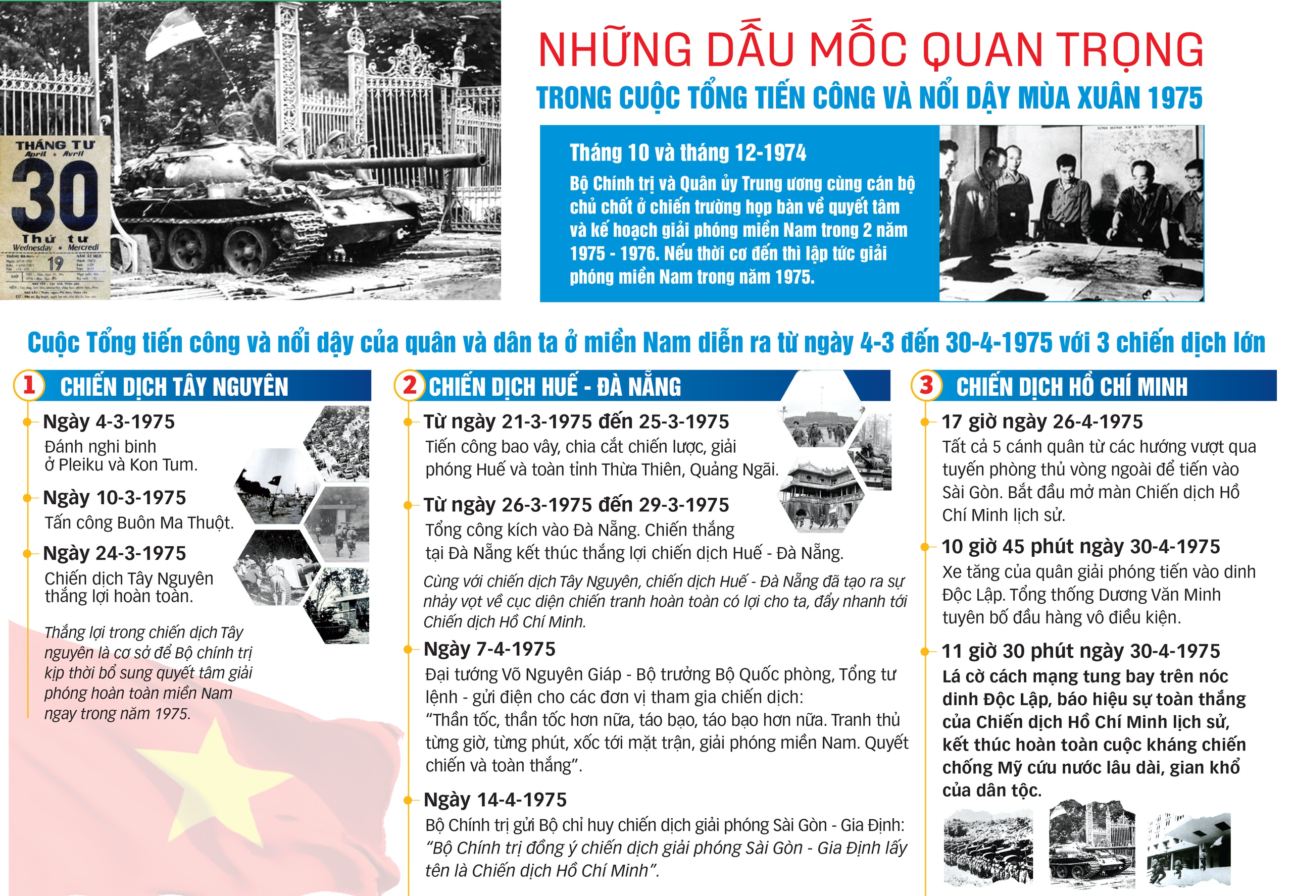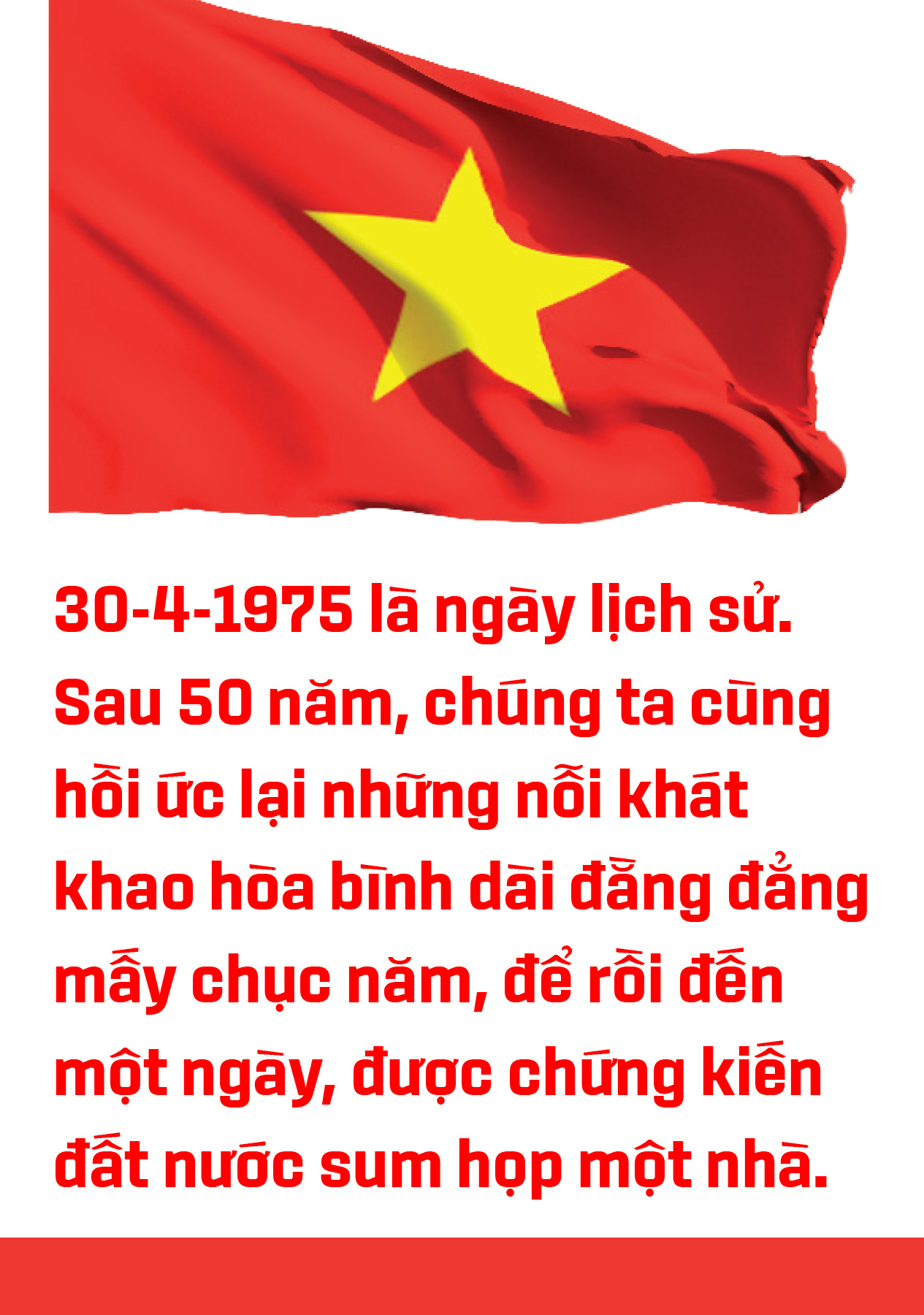 Ngày 30 tháng 4 gợi chúng ta nhớ lại ngày toàn thắng của Chiến dịch Hồ Chí Minh lịch sử. Đất nước, giang sơn thu về một mối. Hiện thực hóa câu nói của Bác Hồ: "Nước Việt Nam là một, dân tộc Việt Nam là một. Sông có thể cạn, núi có thể mòn, nhưng chân lý ấy không bao giờ thay đổi".