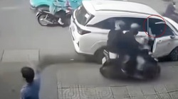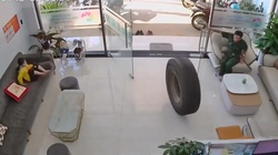 Trong lúc đi qua đường ray tàu hỏa, nam thanh niên chạy xe máy chở 4 người không làm chủ được tay lái ngã nhào xuống đường, sát bánh xe container.