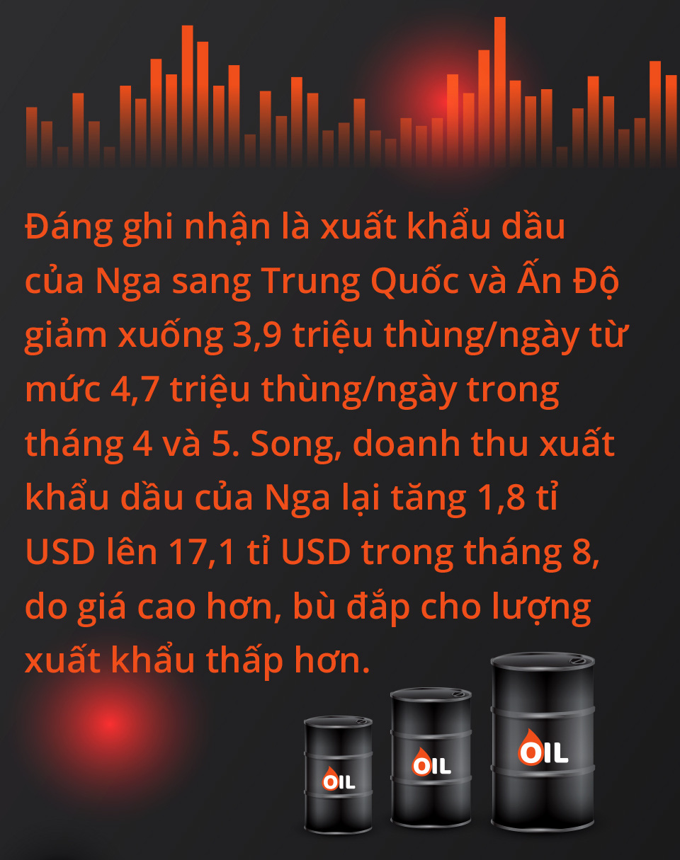 Riêng Nga, tổng xuất khẩu dầu đã giảm 150.000 thùng/ngày trong tháng trước, xuống còn 7,2 triệu thùng/ngày, thấp hơn 570.000 thùng/ngày so với một năm trước.