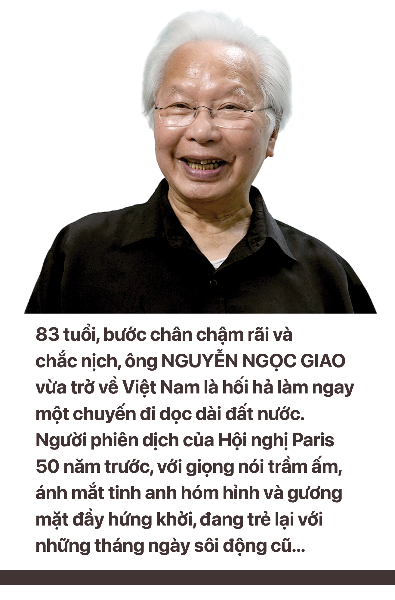 83 tuổi, bước chân chậm rãi và chắc nịch, ông Nguyễn Ngọc Giao vừa trở về Việt Nam là hối hả làm ngay một chuyến đi dọc dài đất nước. Người phiên dịch của Hội nghị Paris 50 năm trước, với giọng nói trầm ấm, ánh mắt tinh anh hóm hỉnh và gương mặt đầy hứng khởi, đang trẻ lại với những tháng ngày sôi động cũ…