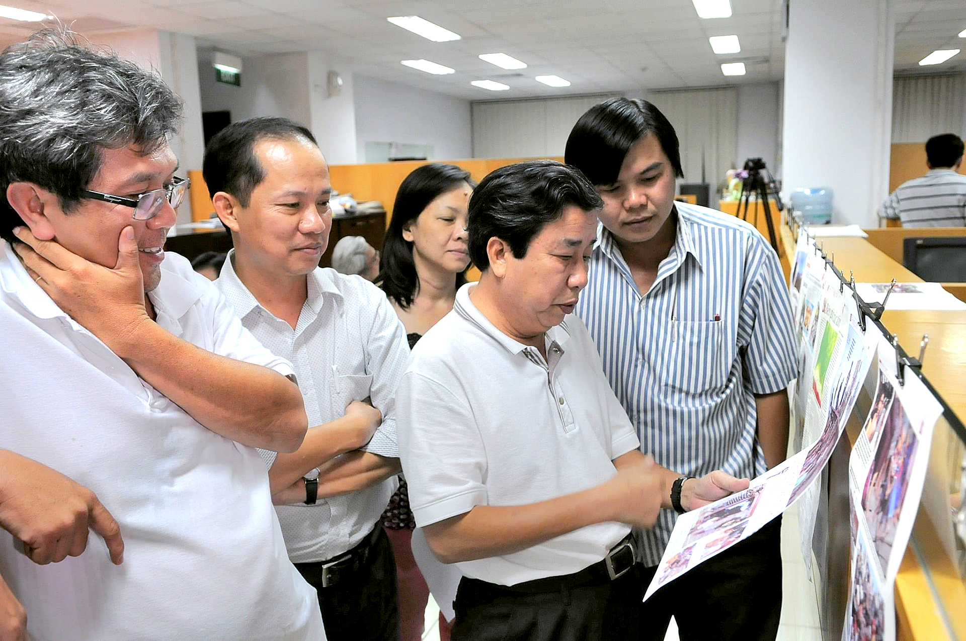 Từ trái qua: Nhà báo Cao Huy Thọ, nhà báo Lê Xuân Trung, nhà báo Thu An, nhà báo Vũ Văn Bình và nhà báo Tăng Hữu Phong
