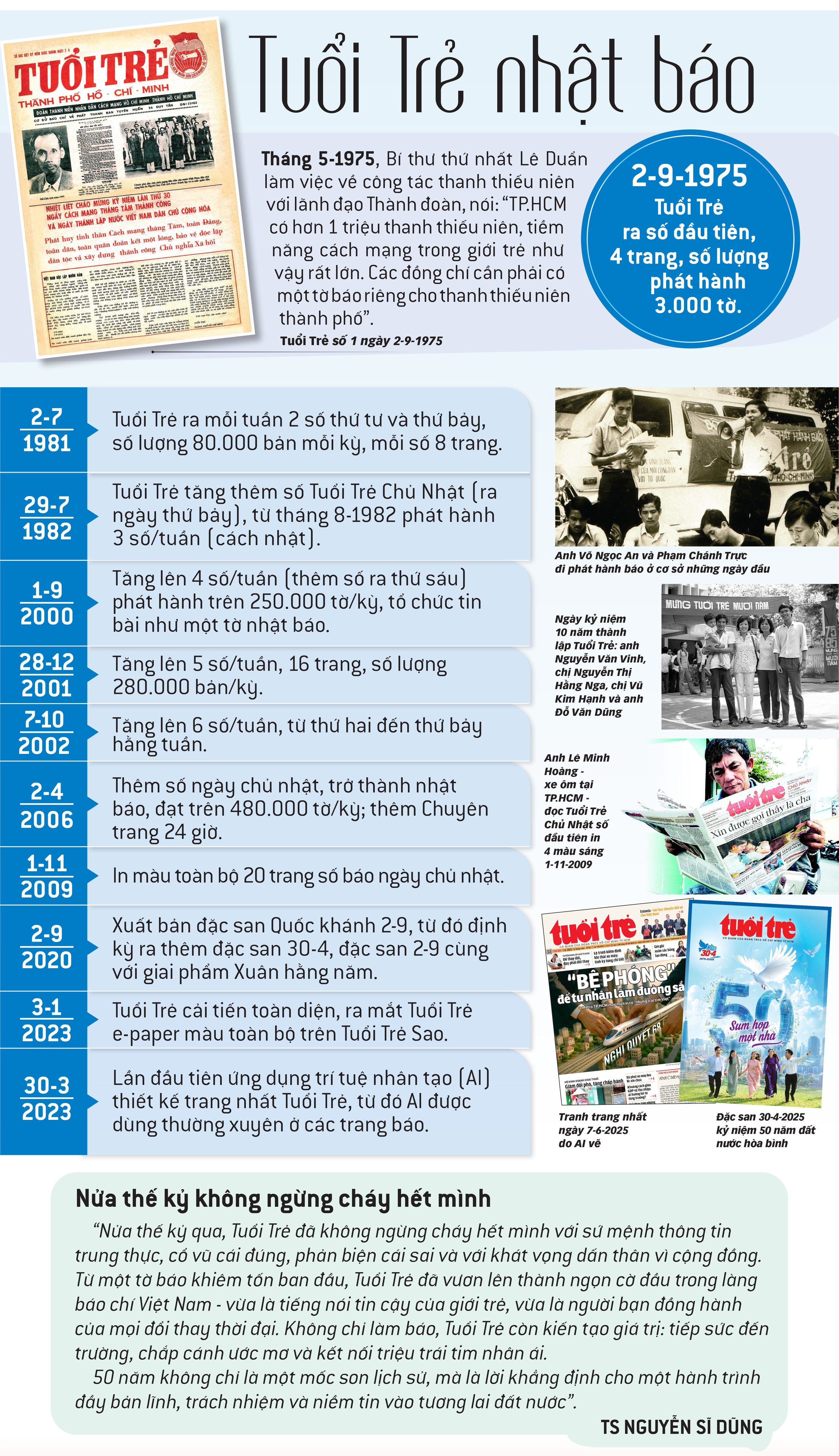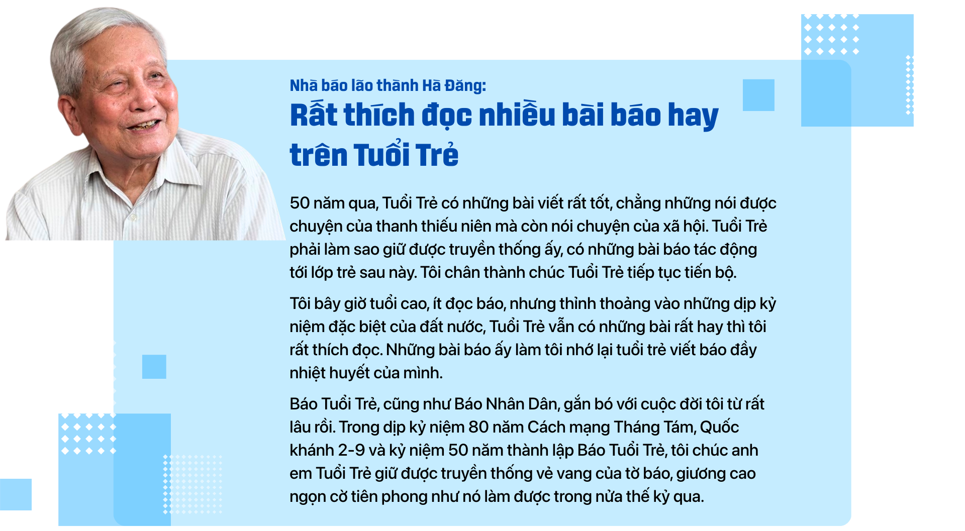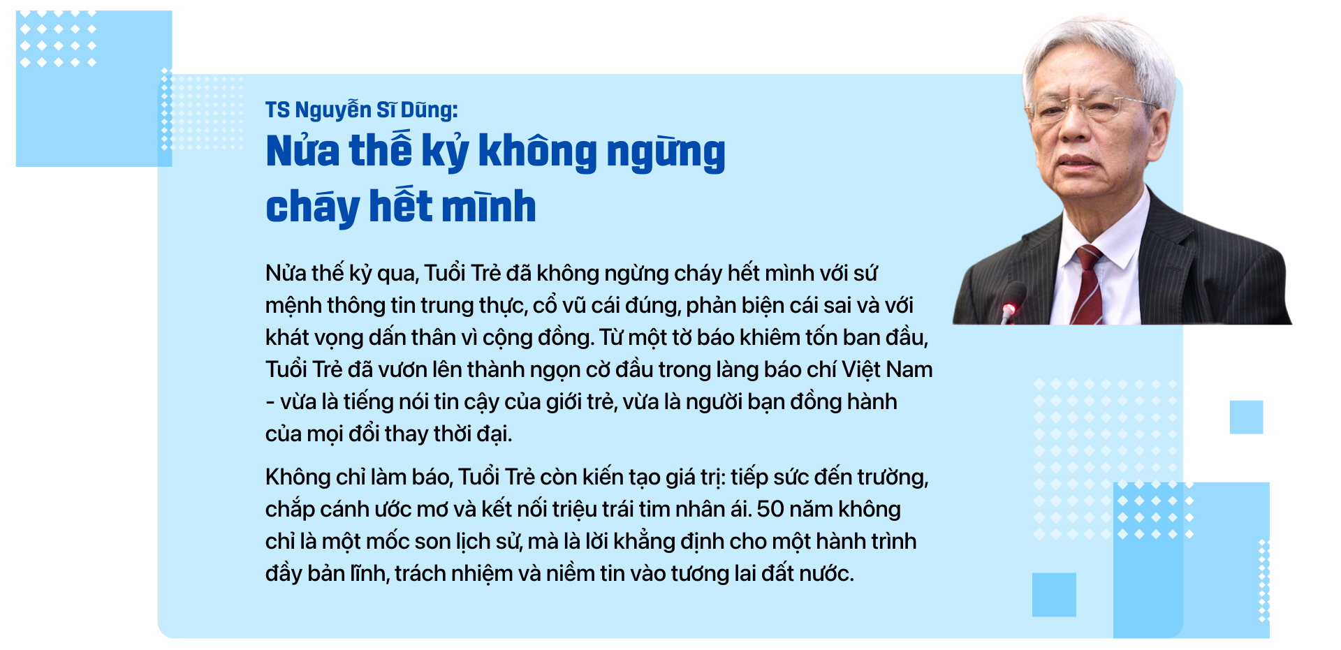 "Có thể nói 50 năm qua, cùng với mốc son 50 năm thống nhất đất nước, cũng là dấu mốc rất quan trọng của Báo Tuổi Trẻ", ông Lê Quốc Minh - tổng biên tập báo Nhân Dân, phó trưởng Ban Tuyên giáo và Dân vận Trung ương, chủ tịch Hội Nhà báo Việt Nam - nhận định và gửi lời chúc mừng đến tờ báo mà ông dành nhiều tình cảm.