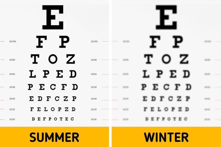 Đôi mắt của chúng ta có thể gặp nhiều vấn đề vào mùa đông hơn so với mùa hè. Chúng ta thường quên đeo kính râm ngăn tia UV vào mùa lạnh, nhưng ánh nắng mặt trời vẫn có thể gây hại nghiêm trọng cho mắt của chúng ta. Lớp màng nước mắt mỏng bao phủ mắt của chúng ta rất nhạy cảm với không khí khô và gió có thể khiến mắt bị khô.