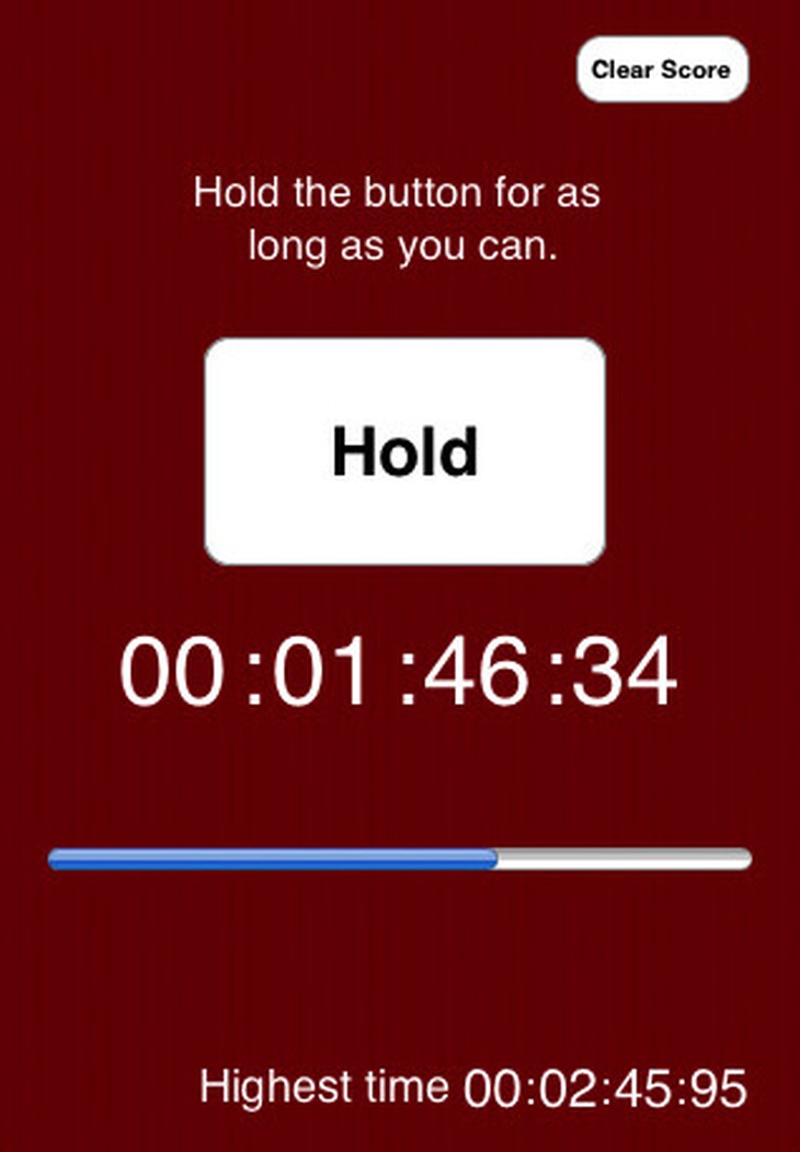 Hold On là một trò chơi cực kỳ đơn giản, chỉ cần bạn đặt ngón tay lên màn hình lâu nhất có thể, ứng dụng sẽ tính thời gian. Mục đích của Hold On là để người dùng tôi luyện đức tính kiên nhẫn. Ứng dụng này cũng rất có ích khi bạn cần “hạ hoả” trong lúc tranh cãi.