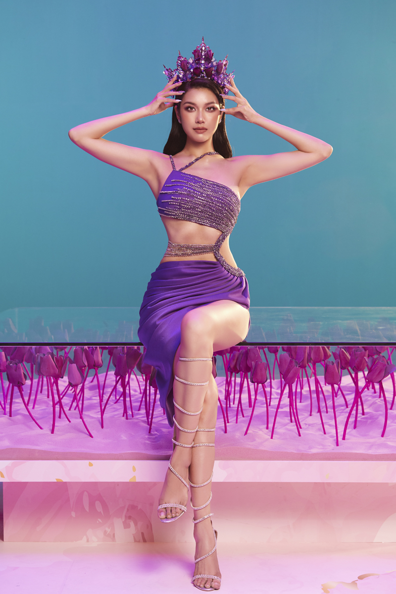Á hậu Thúy Vân đội vương miện màu tím để... đi hát