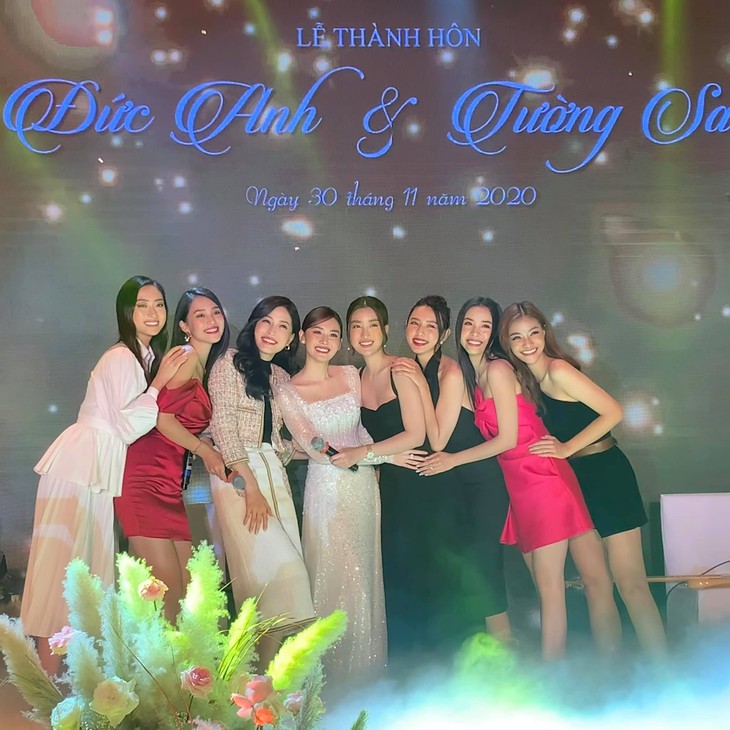 Sau các nghi thức của lễ cưới, dàn bạn thân toàn hoa hậu á hậu của Tường San háo hức chụp hoa cưới. Điều thú vị là bó hoa may mắn đã rơi trúng tay của hoa hậu Trần Tiểu Vy. Cô nàng ngại ngùng đưa vội hoa lại cho hoa hậu Đỗ Mỹ Linh khiến ai cũng phì cười.