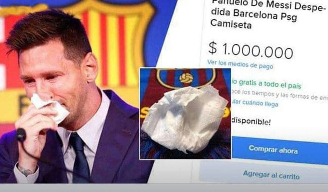 Cư dân mạng đang xôn xao trước thông tin một người ẩn danh đã rao bán khăn lau nước mắt của Messi giá 1 triệu dollar (tương đương 23 tỉ đồng). Dân tình đồn đoán người sở hữu chiếc khăn "đẫm nước mắt" này là một nhân viên phục vụ trong buổi họp báo Messi rời Barcelona.