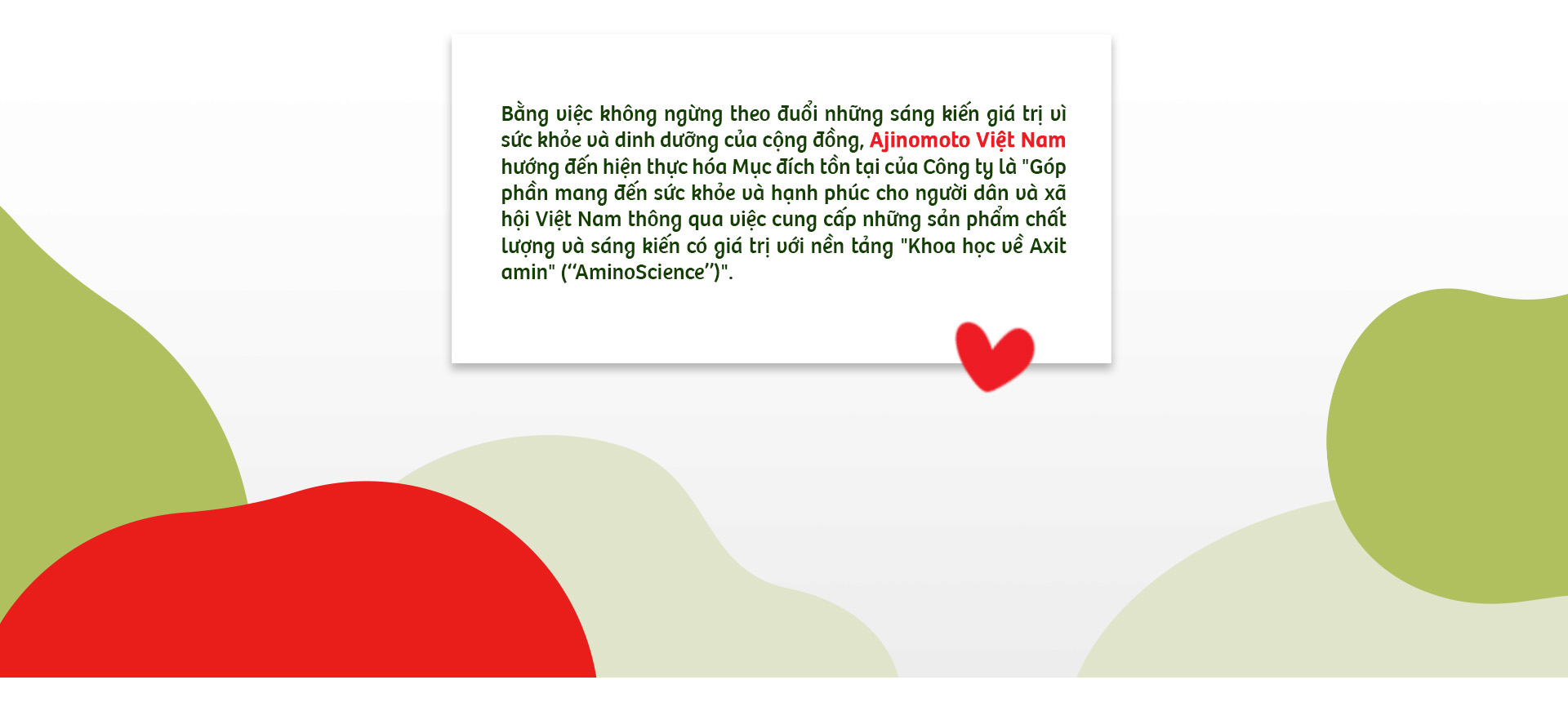 Thông qua hai dự án trọng điểm về dinh dưỡng học đường và dinh dưỡng cho bà mẹ, trẻ em, Ajinomoto Việt Nam đã và đang góp phần vun bồi nền tảng thể chất cho các thế hệ tương lai của người Việt, bắt đầu từ những bữa ăn hằng ngày.
