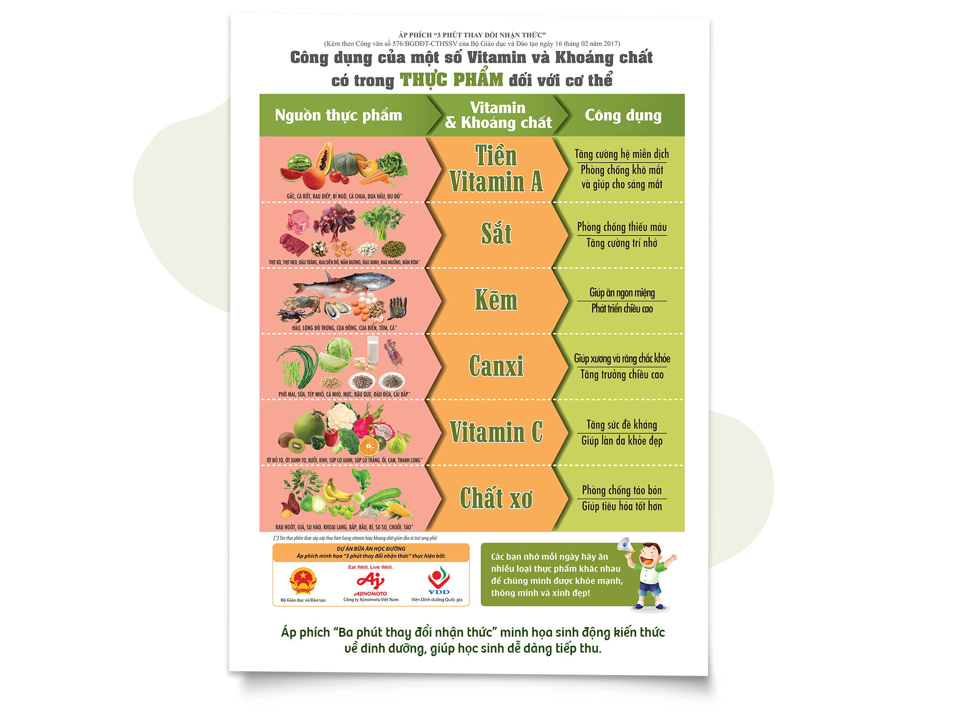 Song song đó, một nội dung khác của Dự án được nhà trường kết hợp với Công ty Ajinomoto Việt Nam để triển khai là Chương trình giáo dục dinh dưỡng "Ba phút thay đổi nhận thức", thông qua các video, tài liệu hướng dẫn nhằm nâng cao ý thức ăn uống lành mạnh trong học sinh. Nhờ đó, nhiều em đã bắt đầu hình thành thói quen ăn uống khoa học, ăn nhiều thực phẩm đa dạng hơn trong mỗi bữa ăn, nhất là biết ăn rau.