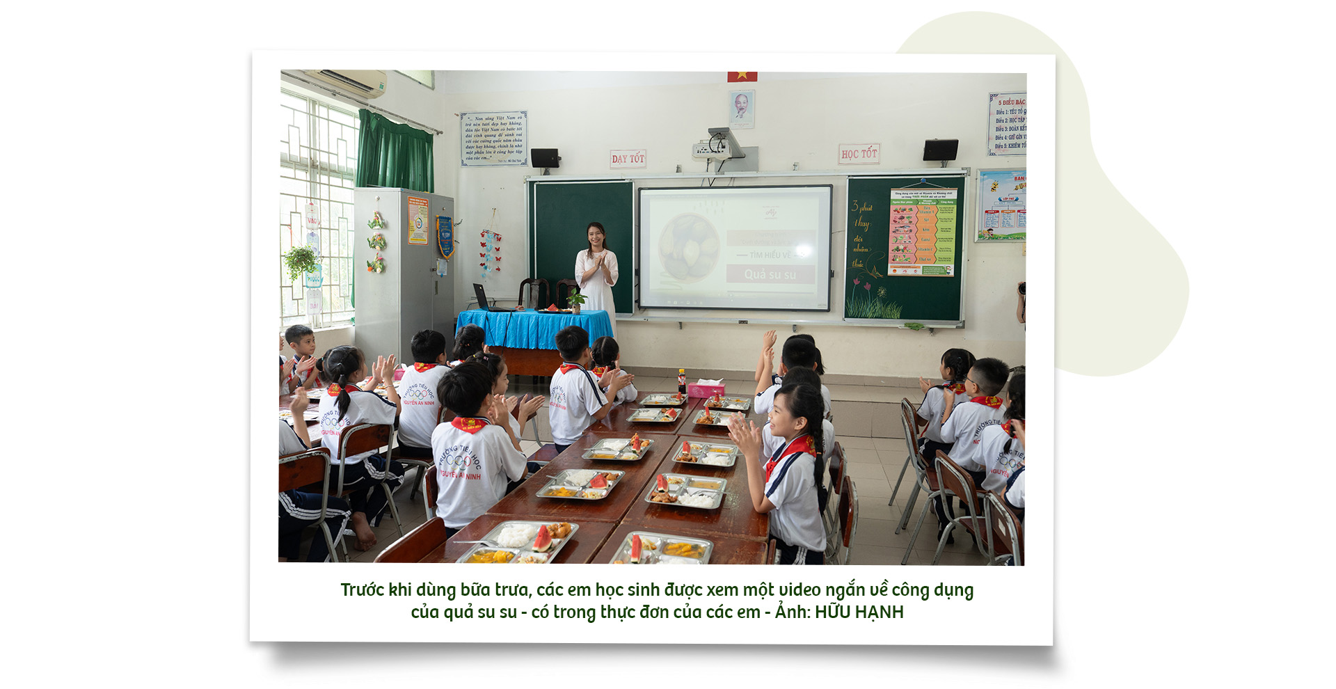 Buổi trưa hôm đó, các em được tìm hiểu về quả su su, trong video được thiết kế sinh động như một "phim hoạt hình" ngắn, kết hợp học nhiều kiến thức như từ vựng và mẫu câu tiếng Anh về quả su su, công dụng chống táo bón của loại quả này, hay những thông điệp thiết thực như "hãy tiết kiệm nước", "dùng hết suất ăn của mình".