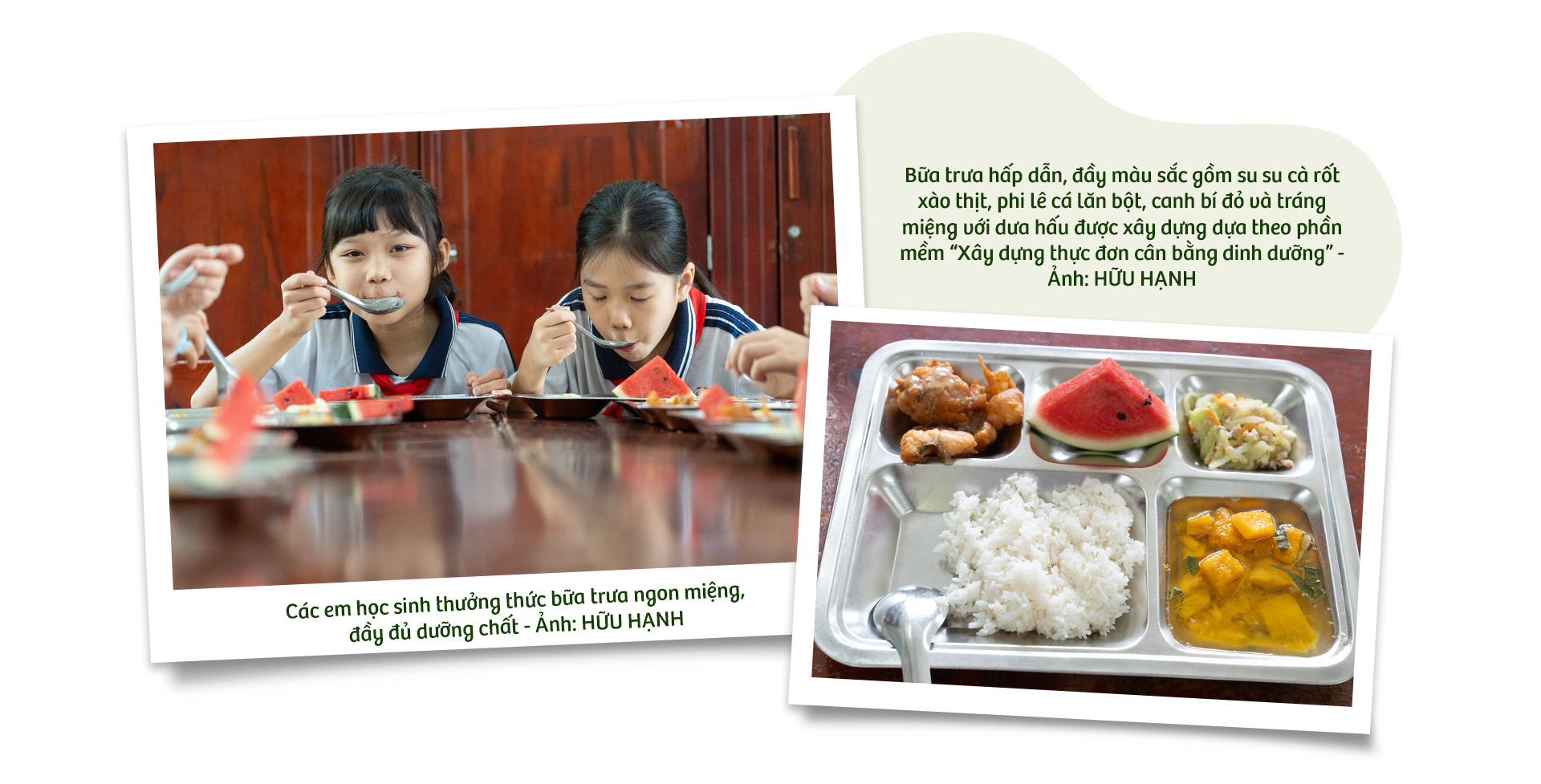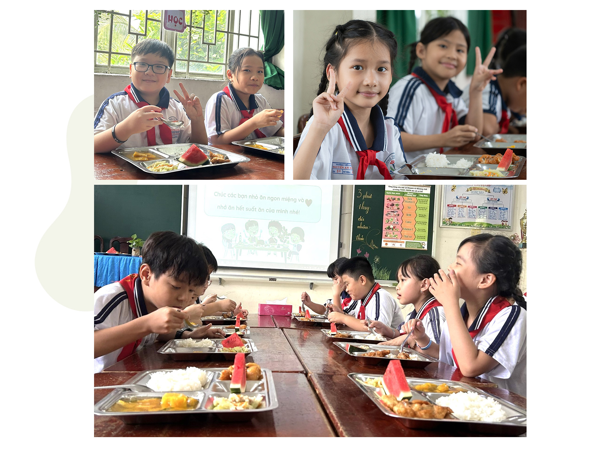 Trước khi dùng bữa trưa, các em học sinh được xem một video ngắn trong vòng 3 phút về công dụng của các loại thực phẩm. Tùy theo nguyên liệu trong mỗi bữa ăn, giáo viên sẽ mở video có nội dung tương ứng. Dọc theo các hành lang, nhà trường cũng treo các áp phích "Ba phút thay đổi nhận thức", với các thông tin về thành phần dinh dưỡng, công dụng của các nguồn thực phẩm như thịt cá, rau củ, sữa… Những thông tin dinh dưỡng được minh họa trực quan, sinh động, bắt mắt này giúp học sinh tiếp cận kiến thức nhẹ nhàng mà hiệu quả.