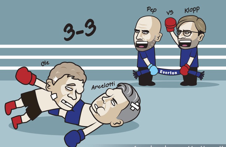 Pep Guardiola và Jurgen Klopp sắp tẩn nhau một trận ra trò ở Ngoại hạng Anh cuối tuần này. Ole Gunnar Solskjaer đã không thể tranh thủ cơ hội khi bị HLV Ancelotti tẩn. Ảnh: Just Toon It.