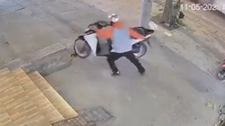 Thấy bánh xe container lăn trên đường, chàng trai phóng xe đạp điện tới chặn lại và bị bánh xe quật ngã.