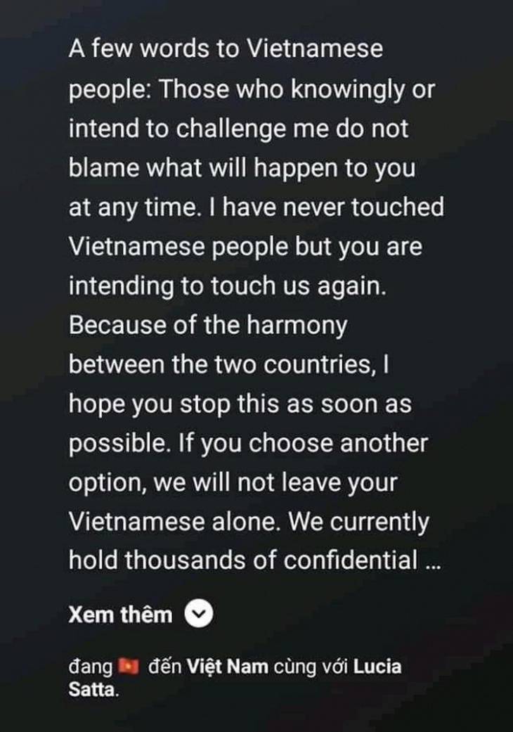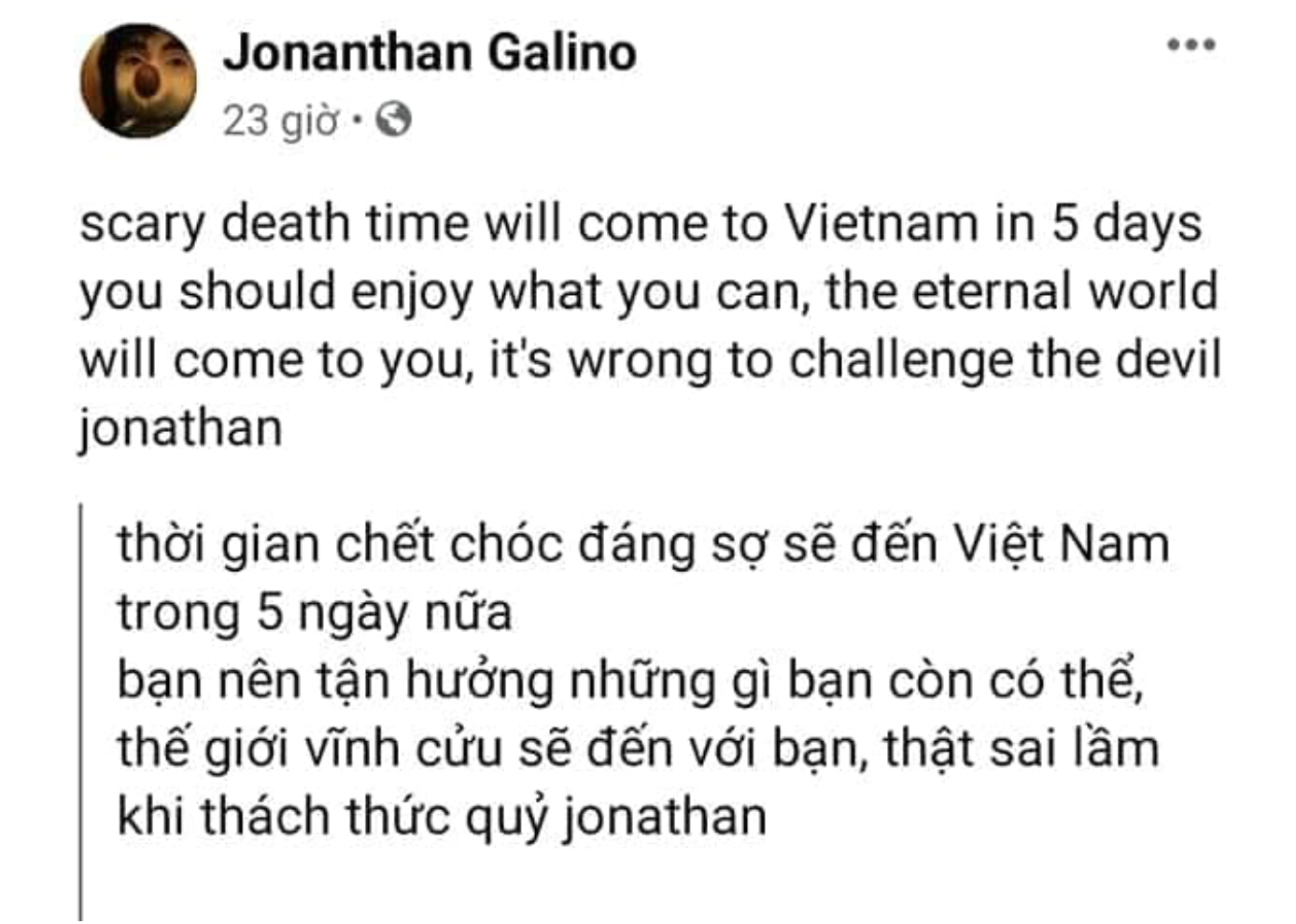 Anh trai Jonathan Galindo cảnh báo thế này:"Thời gian chết chóc đáng sợ sẽ đến Việt Nam trong 5 ngày nữa. Bạn nên tận hưởng những gì bạn có thể, thế giới vĩnh cửu sẽ đến với bạn. Thật sai lầm khi thách thức quỷ Jonathan".