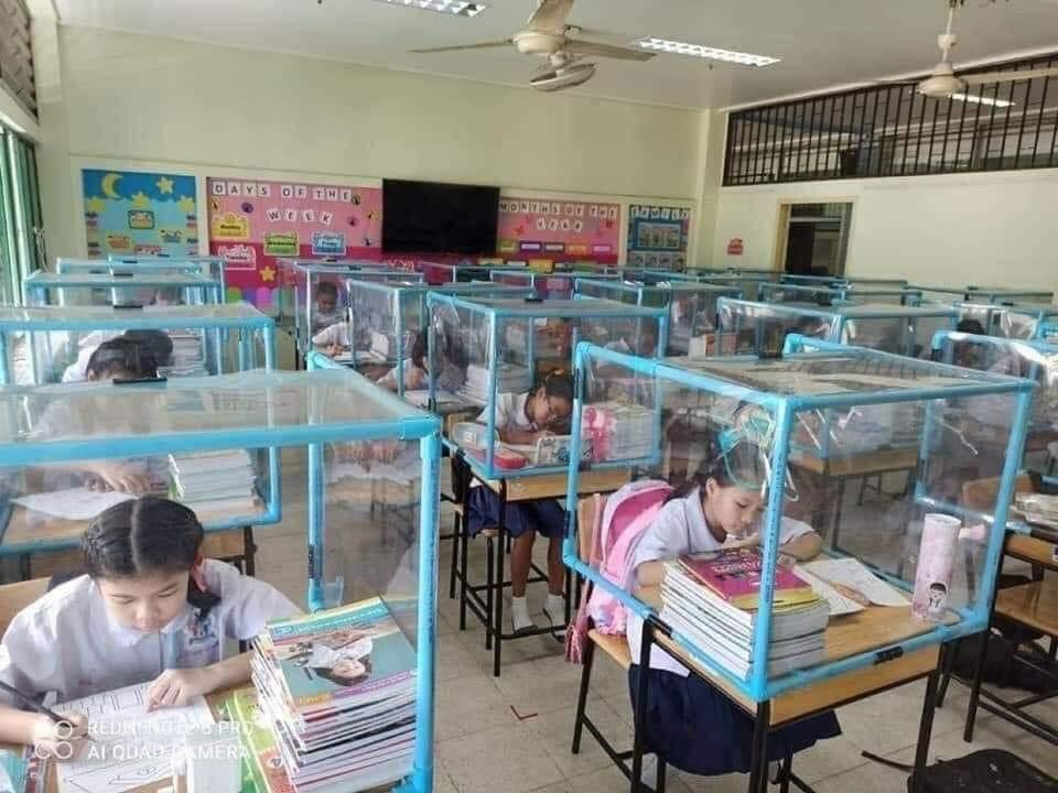 Học sinh Thái Lan được ngồi trong chiếc hộp được dựng từ nilon để tránh Covid. Chưa biết có hiệu quả hay không?!
