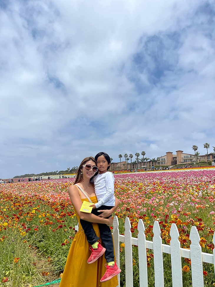 Cựu người mẫu Ngọc Quyên cùng con trai thăm trang trại hoa ở Mỹ.
