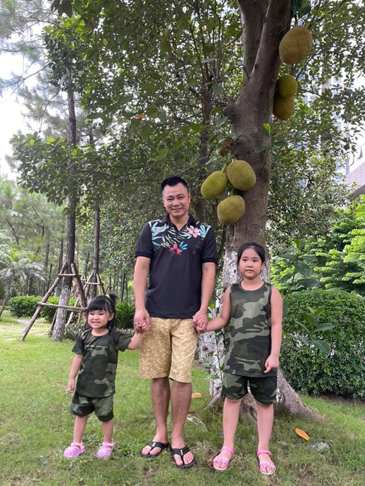 Nghệ sĩ Tự Long cùng hai con gái cưng tranh thủ pose hình cùng cây mít sai trĩu quả.