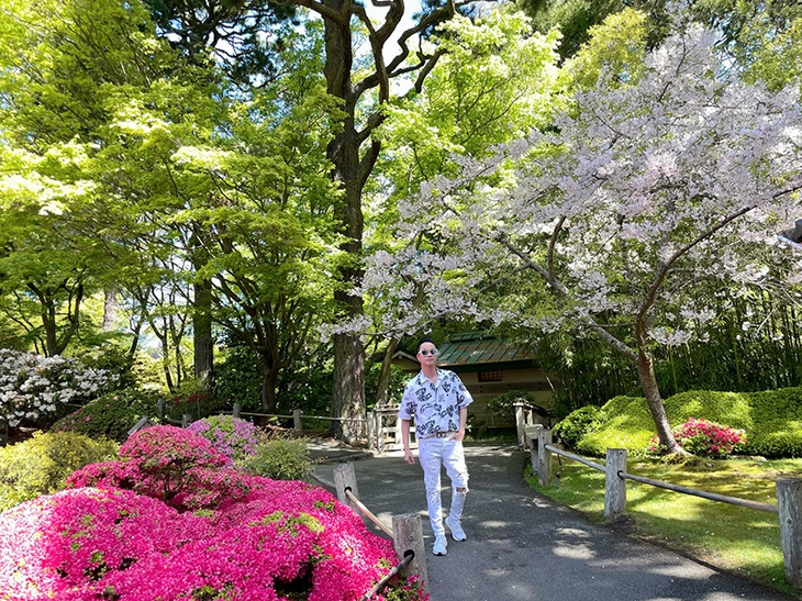 Ca sĩ Nhật Tinh Anh đắm mình vào khung cảnh thiên nhiên xanh mát khi ghé thăm vườn Nhật Bản trên đất Mỹ.