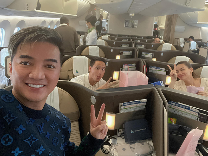 Khoảnh khắc vui nhộn của Mr Đàm bên vợ chồng Hồ Hà khi đáp chuyến bay về Việt Nam sau hơn 1 tuần công tác ở Anh.