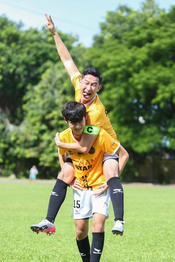 “Gần được ra sân cùng con trai rồi!”, diễn viên Huy Khánh háo hức chia sẻ về bức ảnh được con trai cõng trên sân bóng. Trần Kiến Bách là con trai của nam diễn viên và vợ cũ Lương Hoàng Anh, nay đã cao lớn vượt trội. Nhìn biểu cảm của Bách, nhiều khán giả trêu Huy Khánh: “Con gánh ba còng lưng không anh?”.