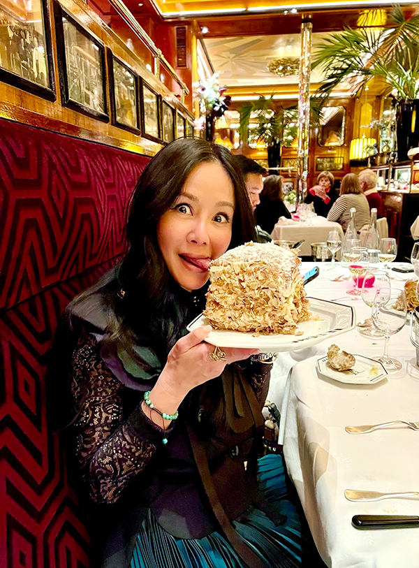 Ca sĩ Hồng Nhung thích thú khi được thưởng thức bánh ngàn lớp (Mille Feuille – đặc sản Pháp).