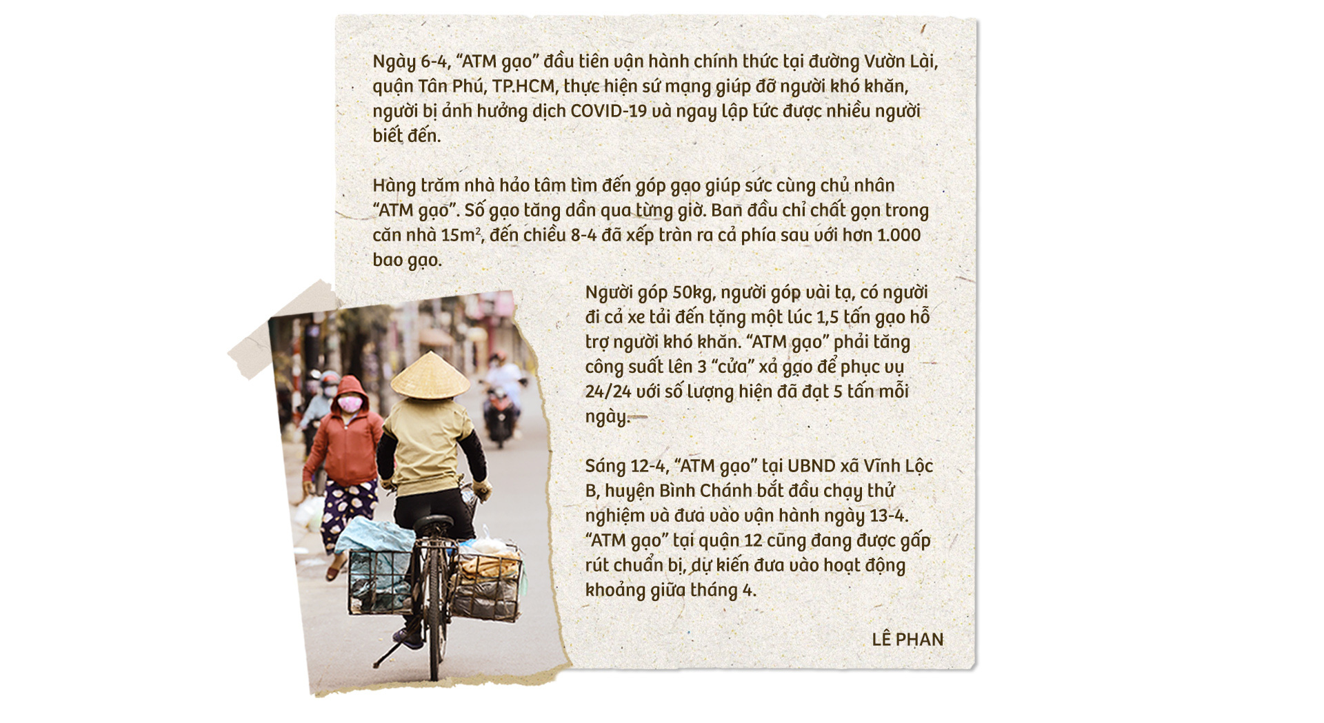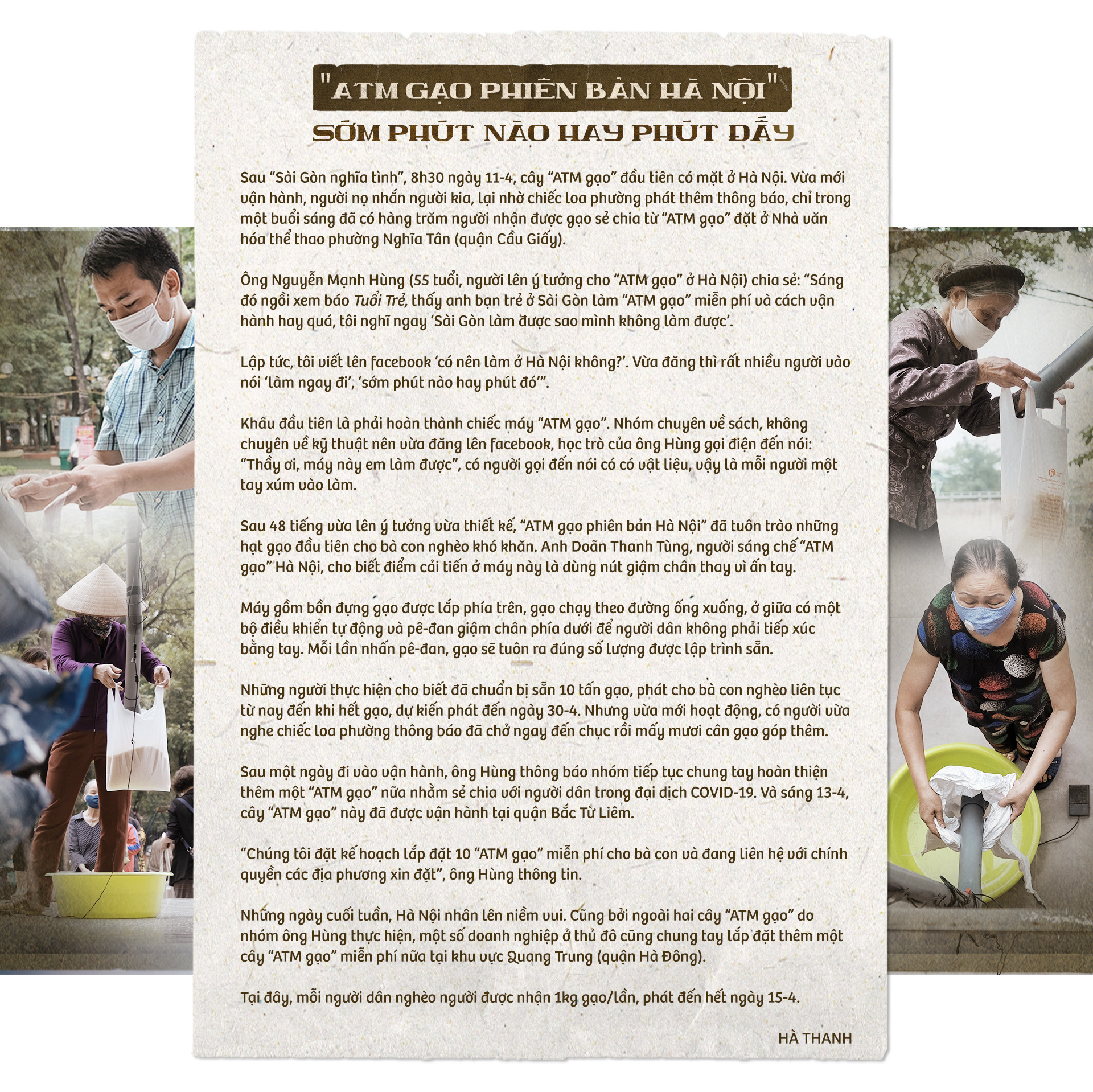 Lượng sức mình, ban đầu tôi dự định phát 500kg gạo mỗi ngày cho tới cuối tháng, khi ấy hi vọng dịch đã qua, nhịp sống sẽ trở lại bình thường. Tôi còn định nhờ mấy người quen biết rao lên giúp để mọi người biết "ATM gạo" mà đến nhận, nên sự phát triển của dự án mấy ngày qua hoàn toàn nằm ngoài dự kiến của mọi người.