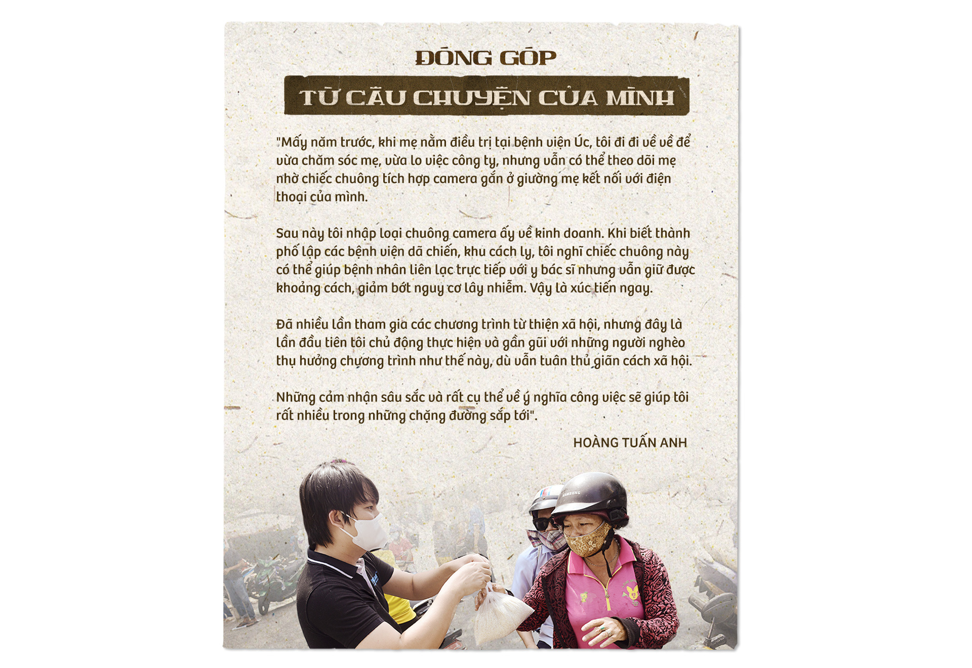 Người nhận gạo đến từ khắp nơi, người góp gạo cũng đến từ khắp nơi, chỉ kịp cười với nhau qua chiếc khẩu trang rồi đi. Việc phát gạo với chúng tôi không còn chỉ là tấm lòng của mình nữa, mà thành một gánh trách nhiệm.