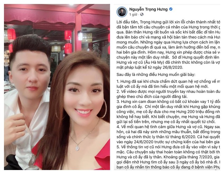Trọng Hưng gửi lời xin lỗi sau ồn ào: “Lời đầu tiên, Trọng Hưng gửi lời xin lỗi chân thành nhất tới khán giả đã bận tâm tới câu chuyện cá nhân của Hưng trong thời gian vừa qua. Bản thân Hưng rất buồn và sốc khi bất đắc dĩ tên Hưng được đưa lên báo chí và mạng xã hội bàn tán theo cách mà Hưng không mong muốn. Những ngày qua Hưng lựa chọn cách im lặng vì không muốn câu chuyện đi quá xa, làm ảnh hưởng đến bố mẹ, người thân hai bên gia đình. Hôm nay, Hưng xin phép được chia sẻ về câu chuyện này một lần duy nhất. Sở dĩ Hưng quyết định lên tiếng bởi Hưng và vợ cũ (Âu Hà My) đã chính thức không còn là vợ chồng về mặt pháp luật kể từ ngày 26/8/2020".