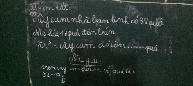 Thế nhưng đọc bài toán đố trên bảng, bỗng chạnh lòng (ảnh). Tại sao là mẹ hái cam đem bán? Và khi đứa bé viết từ “mẹ”, trong đầu em lúc đó nghĩ gì?