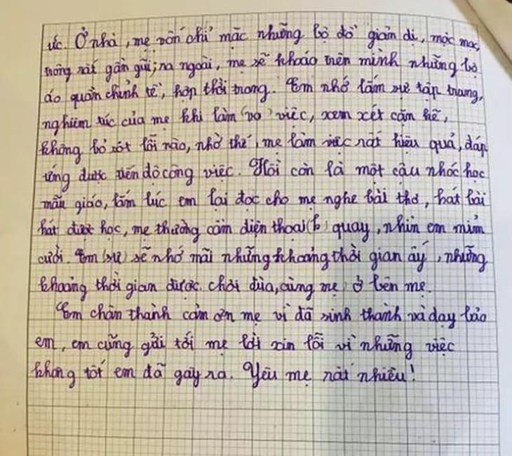 Em nhớ lắm sự tập trung, nghiêm túc của mẹ khi làm việc, xem xét cặn kẽ, không bỏ sót lỗi nào. Nhờ thế, mẹ làm việc rất hiệu quả, đáp ứng được tiến độ công việc. Hồi còn là một cậu nhóc học mẫu giáo, lắm lúc em lại đọc cho mẹ nghe bài thơ, bài hát được học. Mẹ thường cầm điện thoại quay, nhìn em mỉm cười. Em sẽ nhớ mãi những khoảng thời gian ấy, những khoảng thời gian được chơi đùa, cùng mẹ, ở bên mẹ.