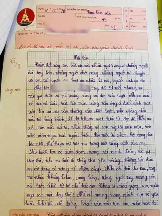 Mới đây, một bài văn của học sinh lớp 5 đã khiến dân mạng tan chảy, khi sở hữu cách hành văn có nhiều từ ngữ hay, đẹp, không đi theo lối mòn khuôn mẫu. Được biết, bài văn có nội dung "tả mẹ" của cậu nhóc này đã được giáo viên chấm đến 7,5/8 điểm, gần như tuyệt đối.