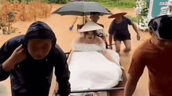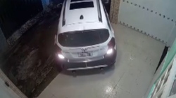 Thấy bạn chạy xe máy tốc độ cao định lách qua khe giữa hai xe tải chạy song song, nam thanh niên ngồi sau hoảng hốt nhảy khỏi xe, ngã xuống đường.