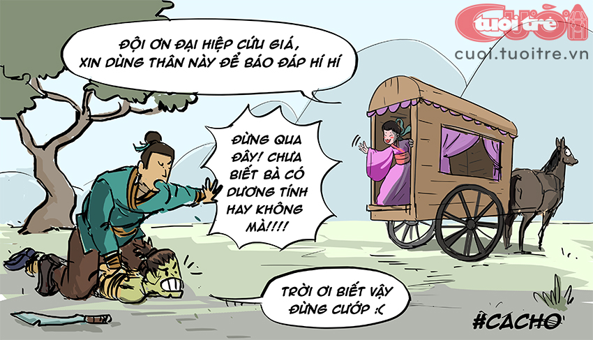 - Cô xin cám ơn chàng đã cứu mạng. Giờ Cô chỉ còn bịch trứng cút và tấm thân này xin báo đáp cho chàng. Kiều Nguyệt Cô nghĩ nhanh: "Chỉ có thằng ngu mới đòi lấy trứng cút".