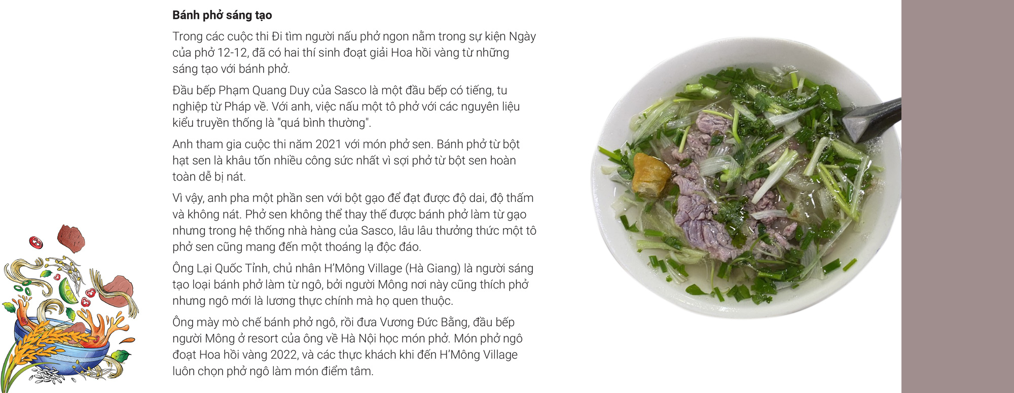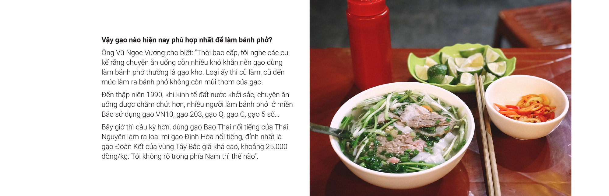 Nhưng hai nhân vật sát cánh cùng các sự kiện Ngày của phở 12-12 ở tiết mục đắp lò làm bánh phở ngay tại ngày hội là chị Thanh Nguyên (phở Hai Thiền) và ông Vũ Ngọc Vượng (phở Ngọc Vượng) đều bảo: Gạo nào nấu cơm càng dẻo, càng thơm ngon thì không thể làm bánh phở được. Gạo dùng để làm bánh phở là gạo cũ, nở nhiều, tơi xốp.