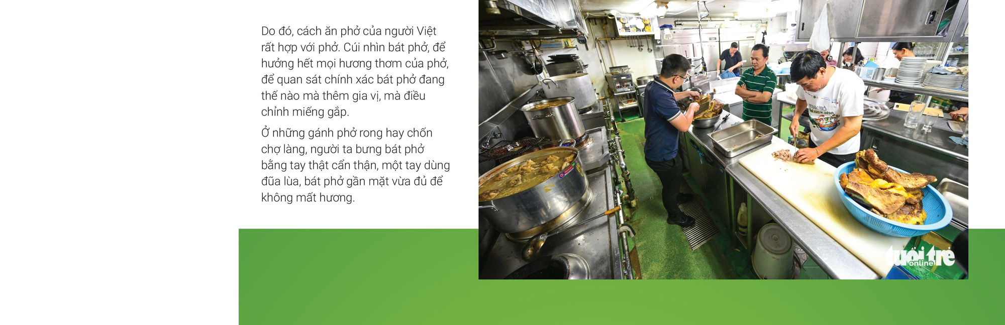 Công việc nặng nhọc đó diễn ra trong hàng giờ, bởi có như thế mới lấy được hết mọi chất ngọt ngào, thơm béo từ mô xương, tủy xương để tạo ra một dung dịch đậm đà mùi bò, hơi gây gây, chỉ cần bay một chút ra đường phố cũng để người qua lại biết được "À, chỗ này đang nấu phở".
