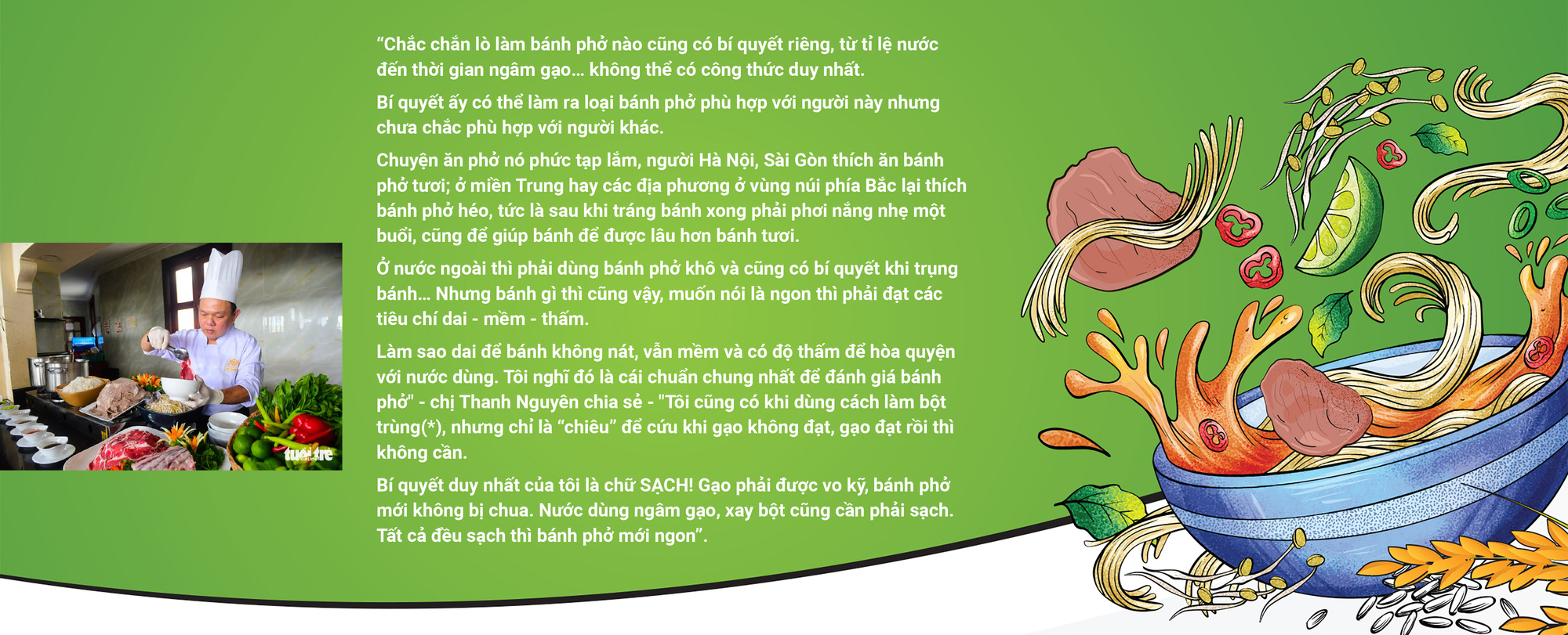 Điều ông quan tâm lớn nhất là làm sao sau khi chần bánh, bỏ vào tô và chan nước dùng, trong 15 phút (tương đương thời gian khách ăn xong), bánh phở vẫn không bở, nát.