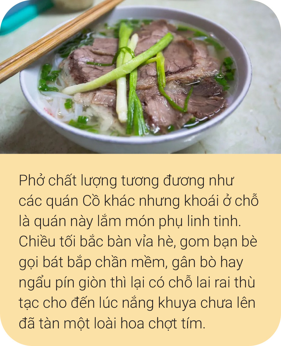 Với đặc trưng bánh to thái dối thủ công, nước dùng đượm vị nước mắm ngon mà ít hương liệu bắc quế hồi thảo quả, phở hiệu Cồ khiến thực khách sành ăn dễ nhận ra cả về hình thức trình bày sơ giản lẫn hương vị mộc mạc mà đằm thắm quê nhà.