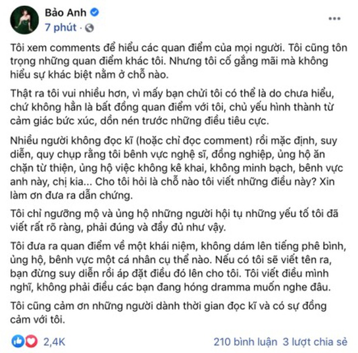 Sau khi bài đăng này được chia sẻ, Bảo Anh nhận về nhiều ý kiến trái chiều cho rằng, nữ ca sĩ đang có ý bênh vực cho những đồng nghiệp là đàn anh, đàn chị trong giới showbiz của mình.