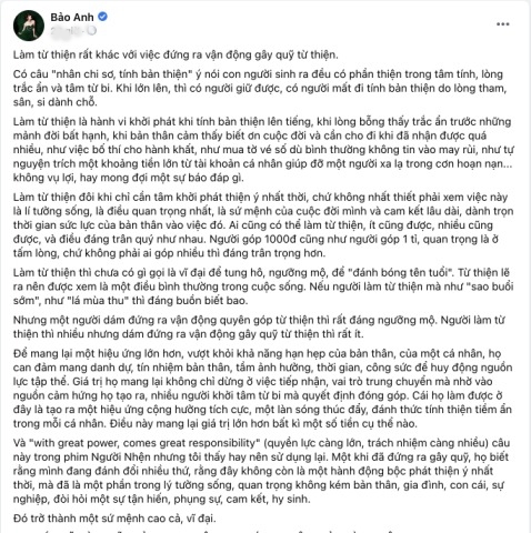 Ngay khi câu chuyện ồn ào việc cư dân mạng nhao nhao đòi nhiều nghệ sĩ như: Đàm Vĩnh Hưng, Trấn Thành, Việt Hương, Thủy Tiên - Công Vinh, Phi Nhung,... phải sao kê tài khoản từ thiện, thì sáng 27-8, ca sĩ Bảo Anh đăng đàn với dòng chia sẻ gây bất ngờ.
