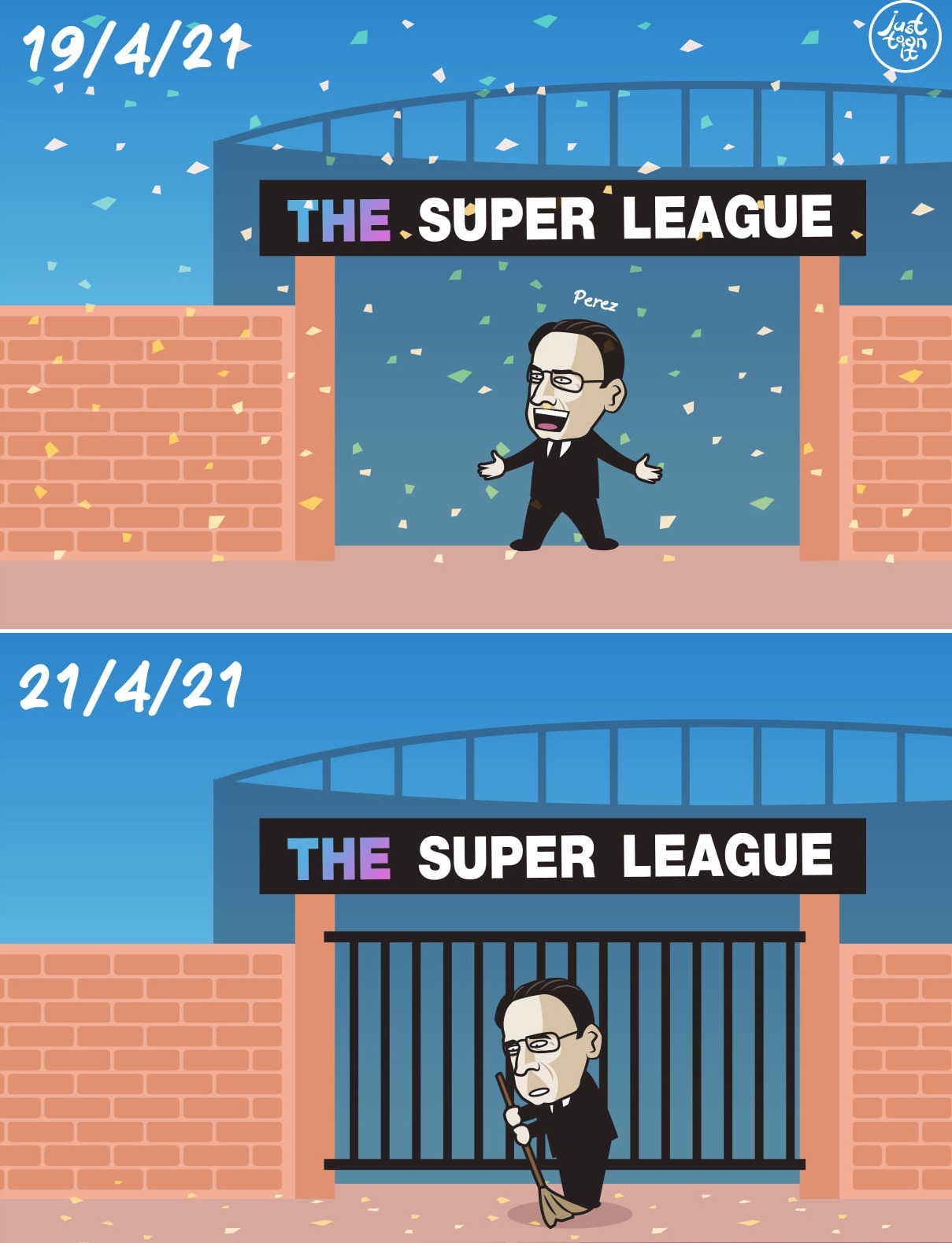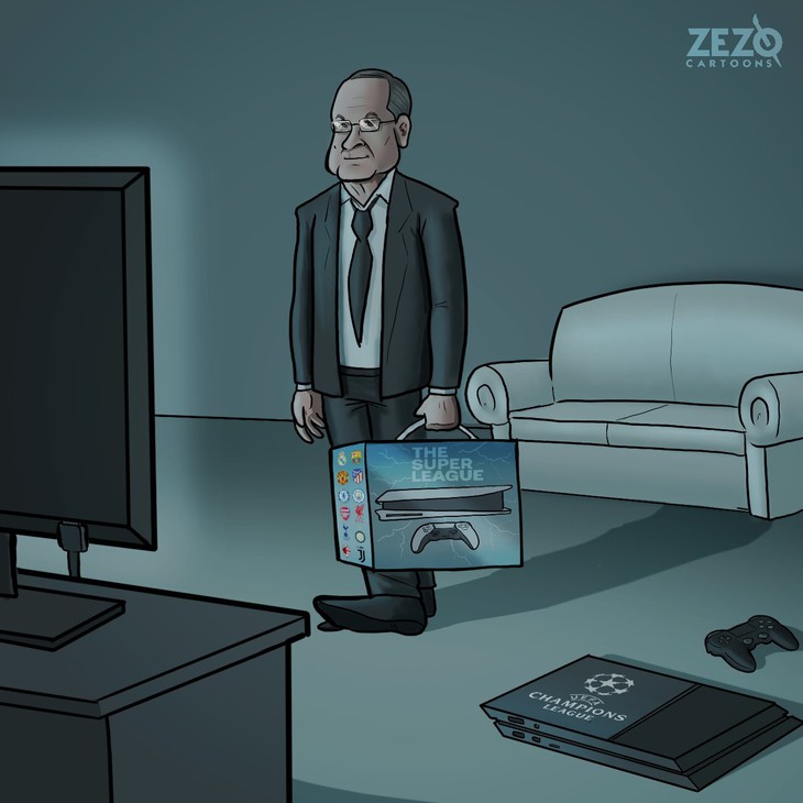 Từng rất hăm hở với ý tưởng European Super League, giờ bầu Rét (Florentino Perez - chủ tịch Real Madrid) bị bỏ lại bơ vơ. Ảnh: Just Toon It.Ai cũng biết bầu Rét không nói chơi. Thế nhưng ít nhất cũng dăm ba năm nữa, ý tưởng về European Super League khó mà được hiện thực hóa gần như lúc này. Mà giờ bầu Rét cũng 74 tuổi rồi chứ ít đâu. Thôi chắc chờ người kế nhiệm ông đi lật đổ UEFA và lập Super League thôi chứ không biết sao.