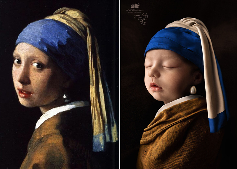 "Cô gái đeo khuyên tai ngọc trai" bản gốc và "bản phake" nhí.Ông bố trẻ Lucas de Ouro chia sẻ: "Tôi lấy cảm hứng từ những tác phẩm nghệ thuật mà cả hai vợ chồng đều yêu thích. Đồng thời, tôi muốn ghi lại những khoảnh khắc đáng yêu của đứa con gái chỉ mới 18 ngày tuổi của mình. Những bức ảnh đã rất thành công trên mạng xã hội và được nhiều studio nhiếp ảnh sử dụng để quảng cáo cho họ".
