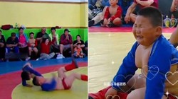 Sau khi quật ngã đối thủ, bé gái tiếp tục dùng chiêu khóa tay buộc trọng tài phải can thiệp.