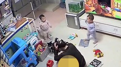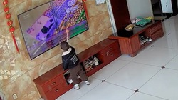 Bé trai cầm súng đồ chơi nghịch ngợm, đứng ngơ ngác khi vô tình làm vỡ màn hình tivi.