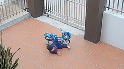 Đứng chụp hình bên robot mô hình, bé trai hú hồn khi thấy nó cử động hướng về phía mình.